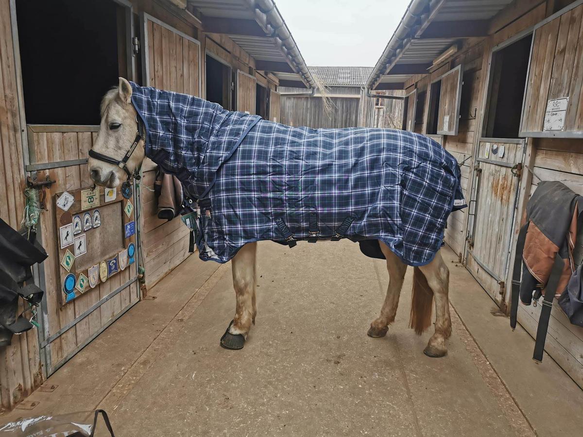 Couverture d'Extérieur Rhino® Plus Vari-Layer 450g Taille 140 Épaisseur extérieure en polypropylène 1000D Couvre cou amovible inclus Compatible liner La couverture est neuve. N’a été portée qu’une fois pour essayage