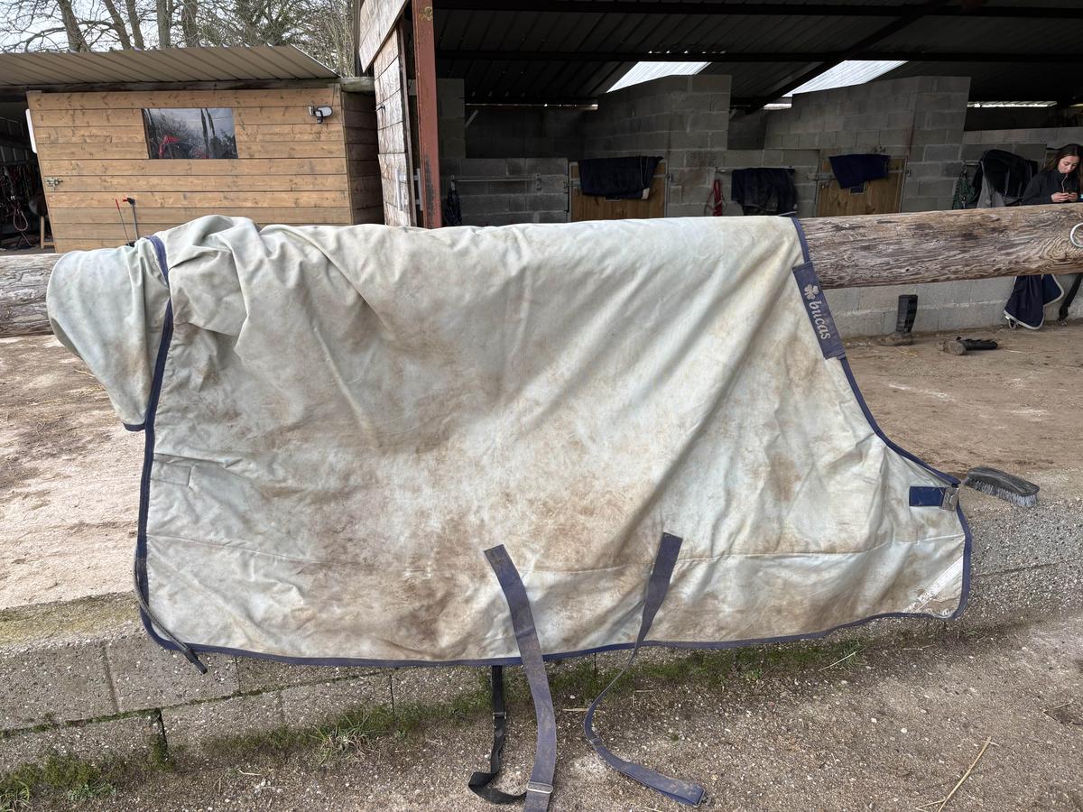 La couverture est en bon état général, elle est seulement sale et a un trou sur le devant qui n’est PAS en contact avec la peau du cheval, donc qui ne pose aucun problème pour l’imperméabilité.