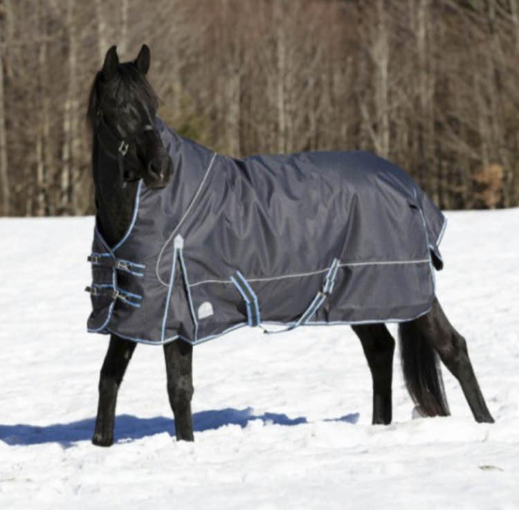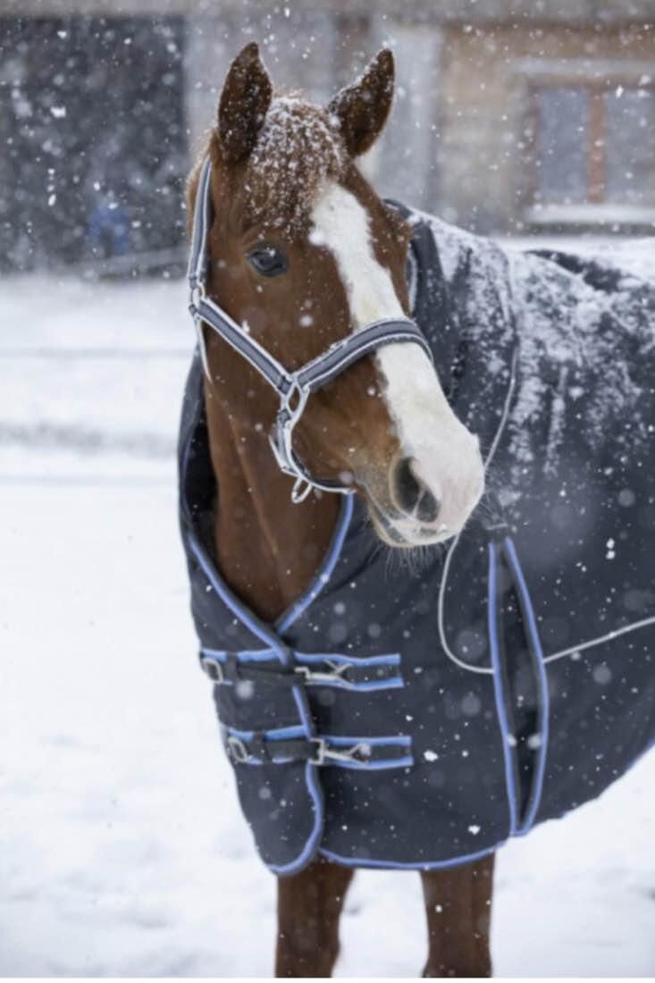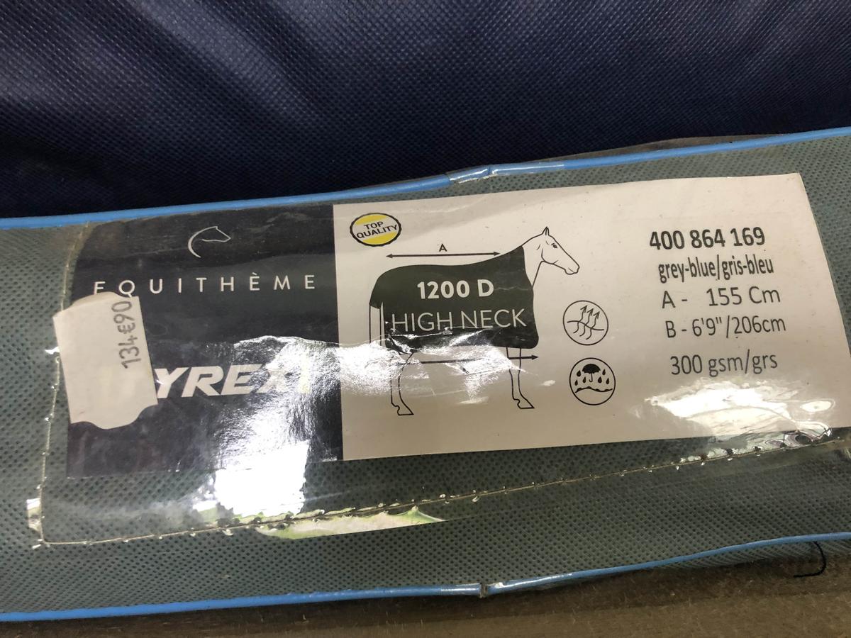 vend cause erreur de taille, couverture d’extérieure 300grs (1200deniers) en taille 155cm de la marque Equitheme/ modèle Tyrex high neck. couleur gris/bleu