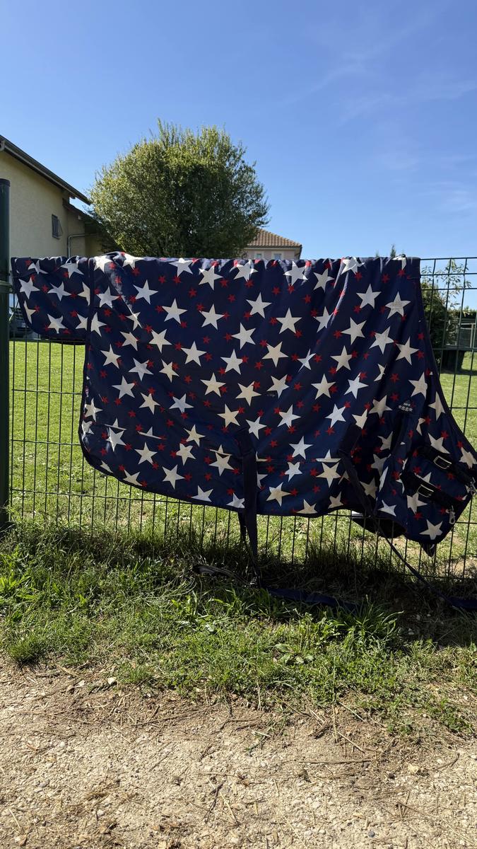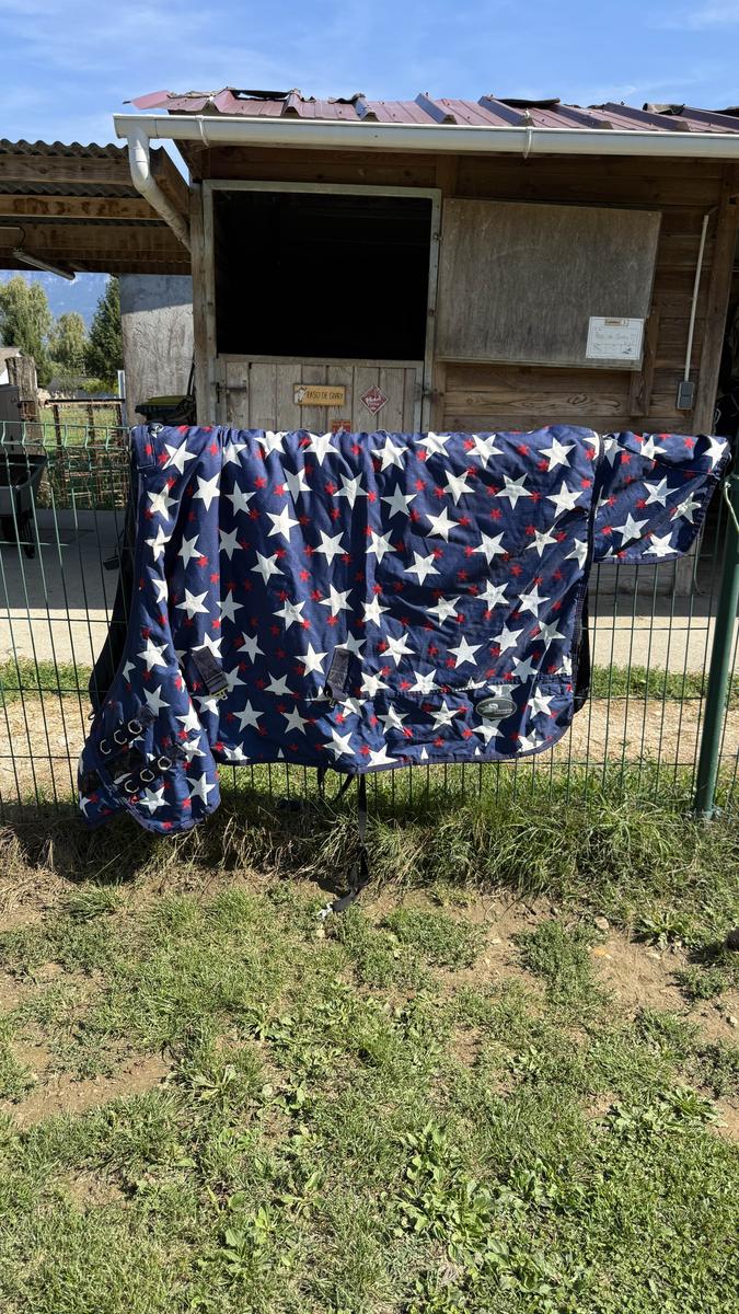 Couverture 300g Performance. Fermeture avant avec velcro et mousquetons, sangles ventrales et sangle cuisses. Rebfort polaire au niveau du garrot.