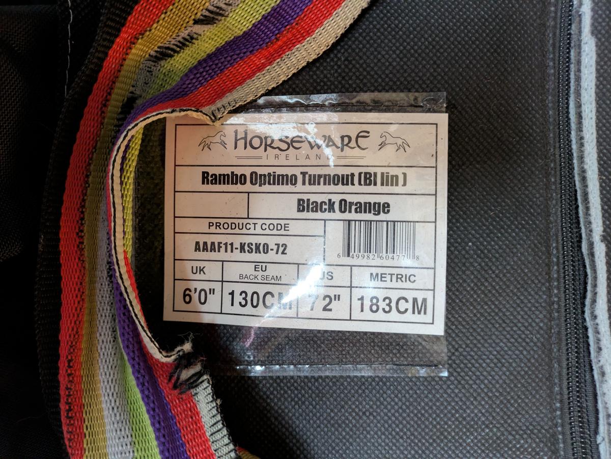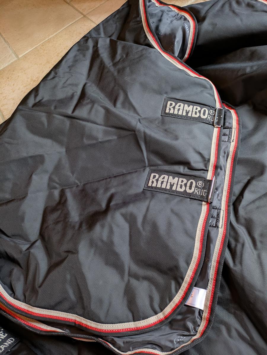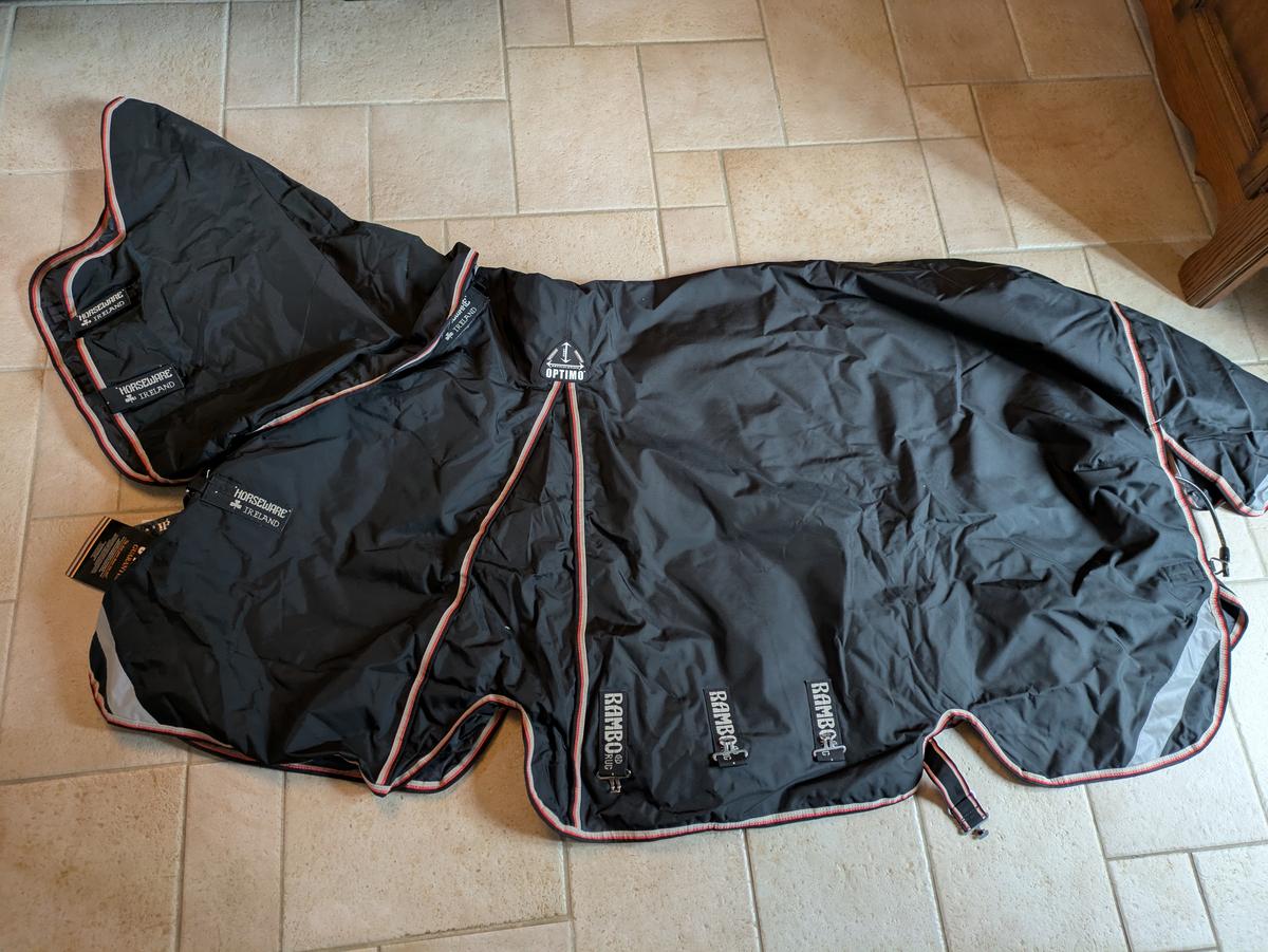 Couverture d'extérieur Horseware Rambo Optimo, neuve avec étiquette. Chemise imperméable 0g avec couvre-cou (taille L). Taille 130 cm / 6.0 mais taille grand, correspond à une 135 voir 140 (6.6). Liner 400g vendu séparément, prix possible pour les deux.