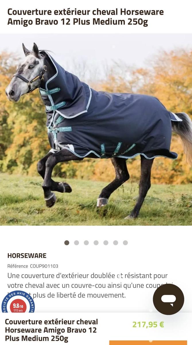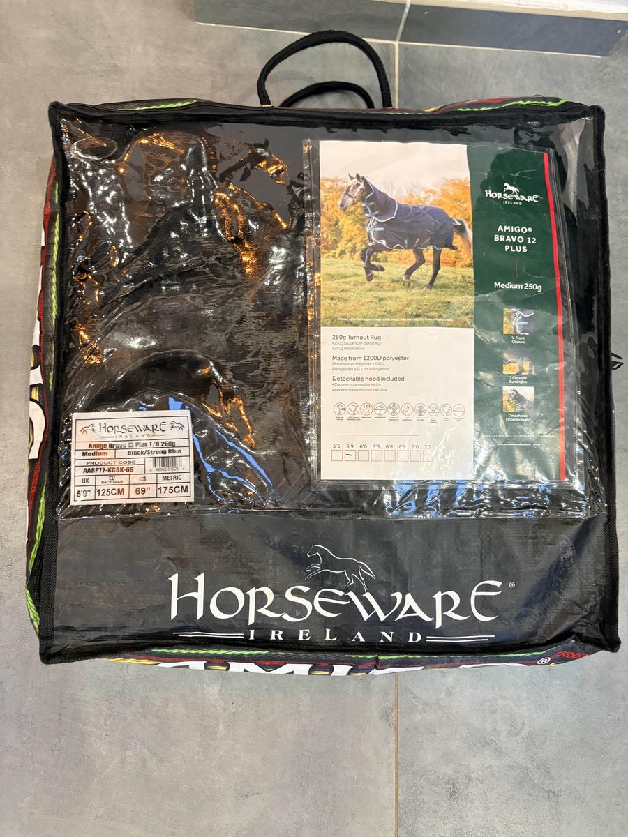 Très belle couverture de paddock Horseware avec couvre cou amovible. De couleur noire avec un liseret bleu roi . Grammage de 250g , taille 125 cm . Modèle Amigo Bravo 12 plus . En parfait état, comme neuve , utilisée seulement 2 ou 3 jours , a été lavée. Vendue plus de 200€ dans les selleries .