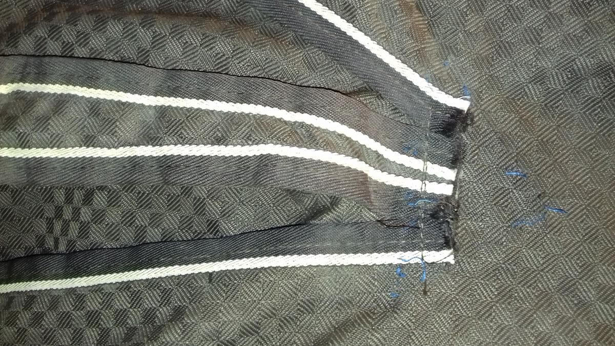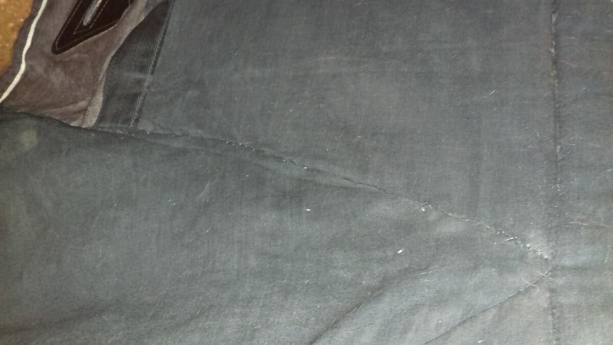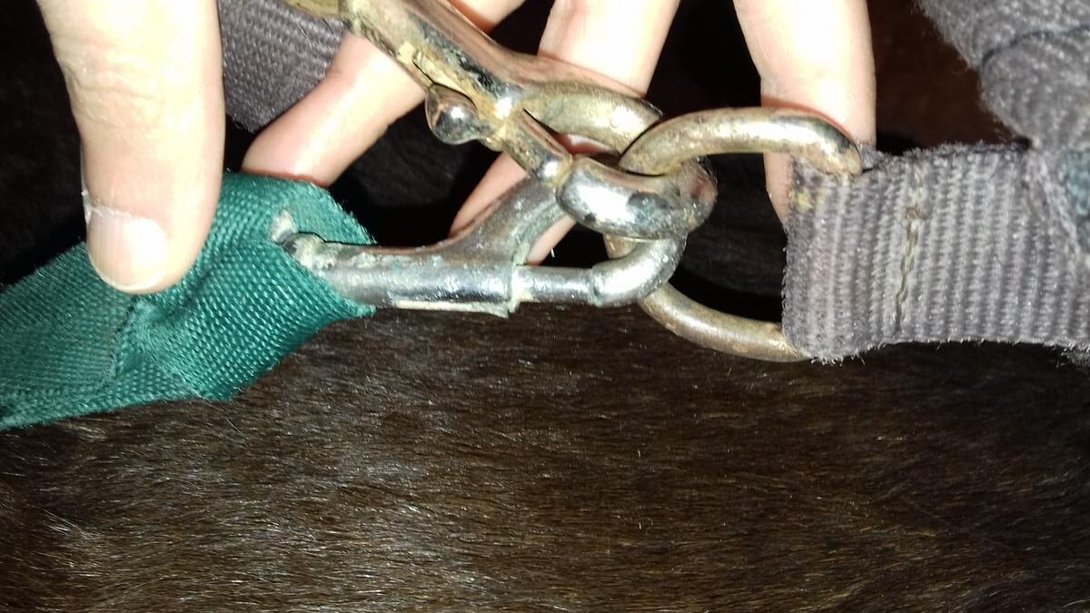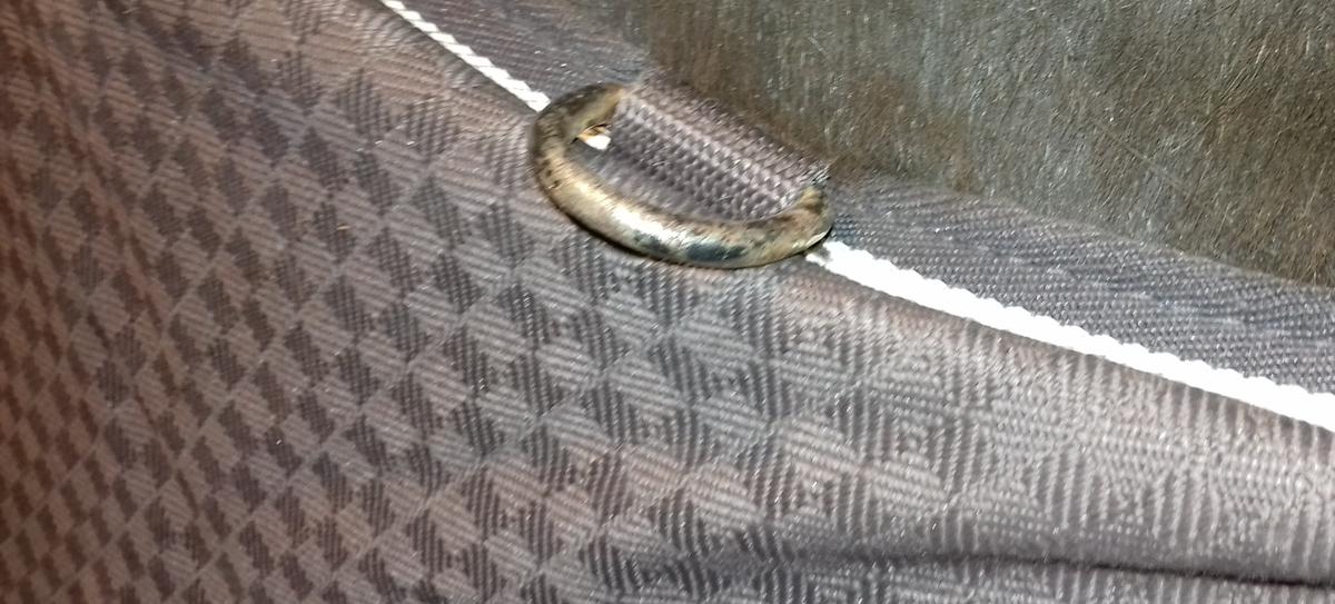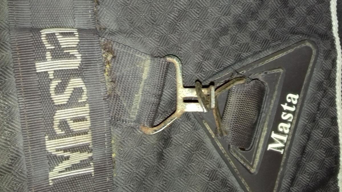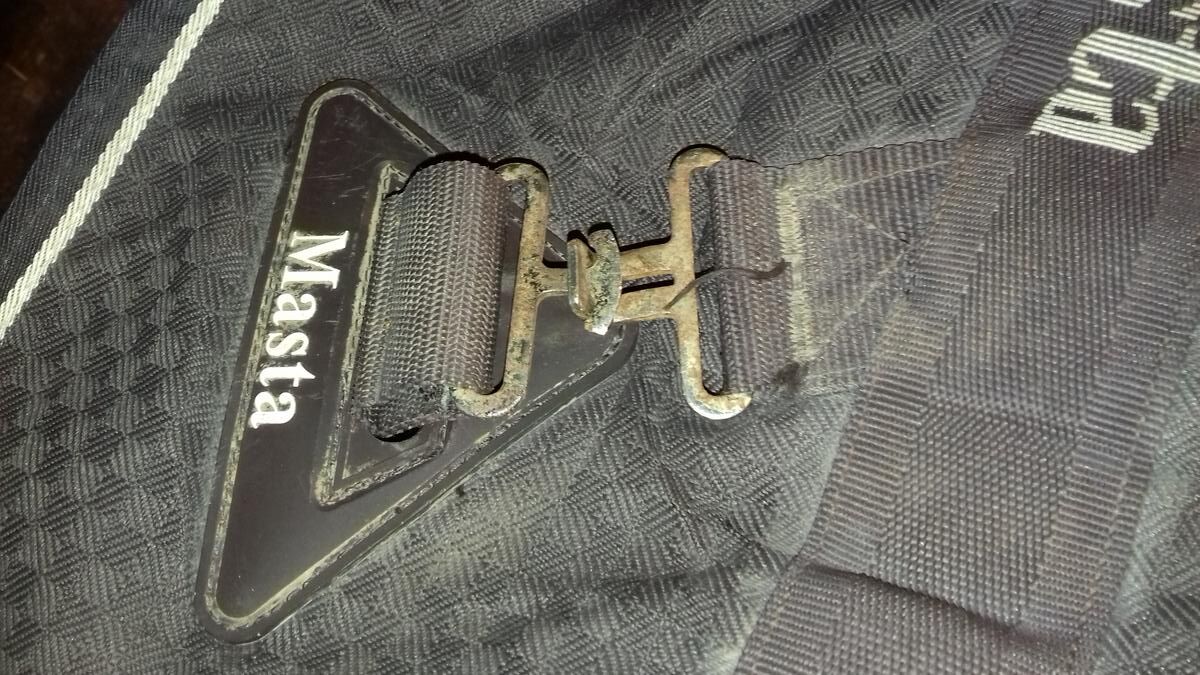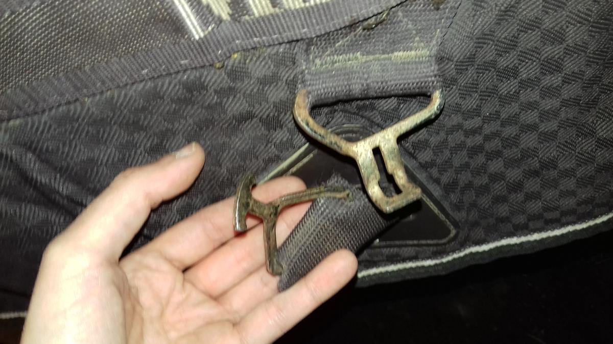Un anneau de sangle est déformé mais reste fermable sans problème ; il manque le petit sanglon arrière droite pour fermer derrière (possibilité d'utiliser le petit sanglon vert pour fermer sous la queue à la place, cf. photos) ; le mousqueton du petit sanglon vert a perdu sa boule donc dur à ouvrir ; couverture rabibochée à plusieurs endroits à l'intérieur et à l'extérieur.