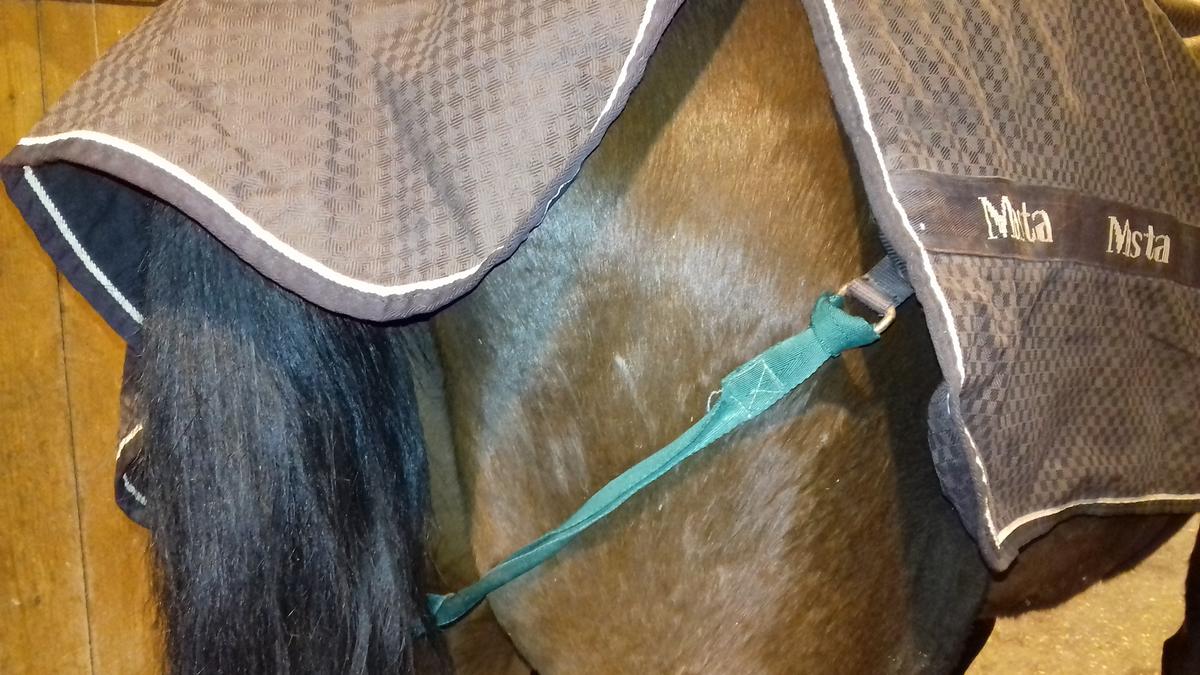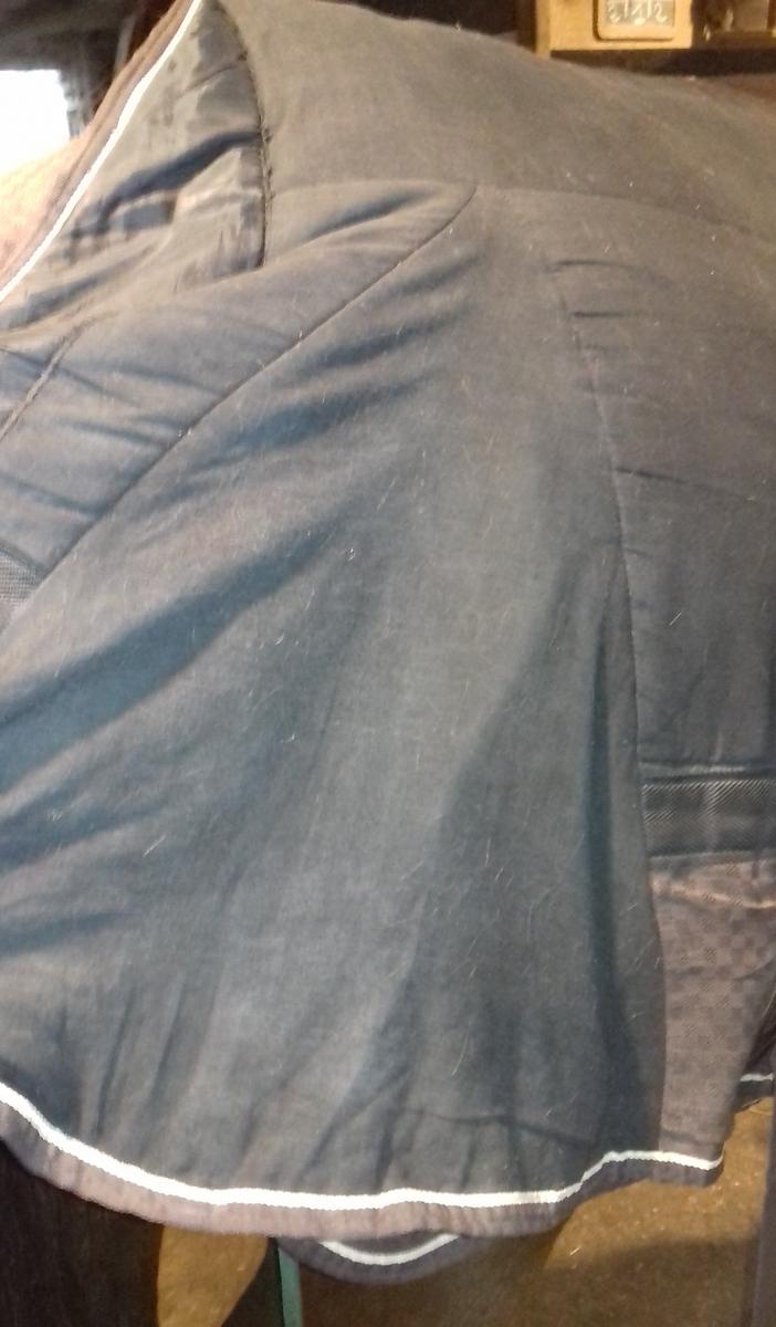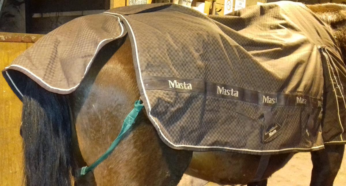 La couverture est posée sur un cheval trop grand (pas d'autres canassons à portée de main!) juste pour bien la montrer en photos.