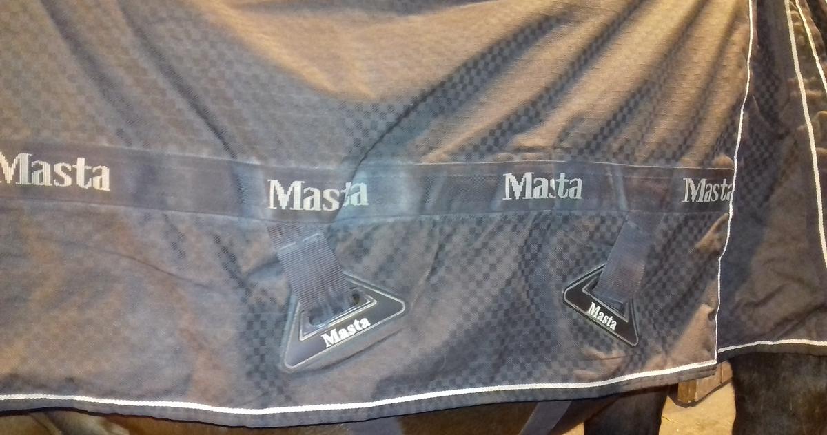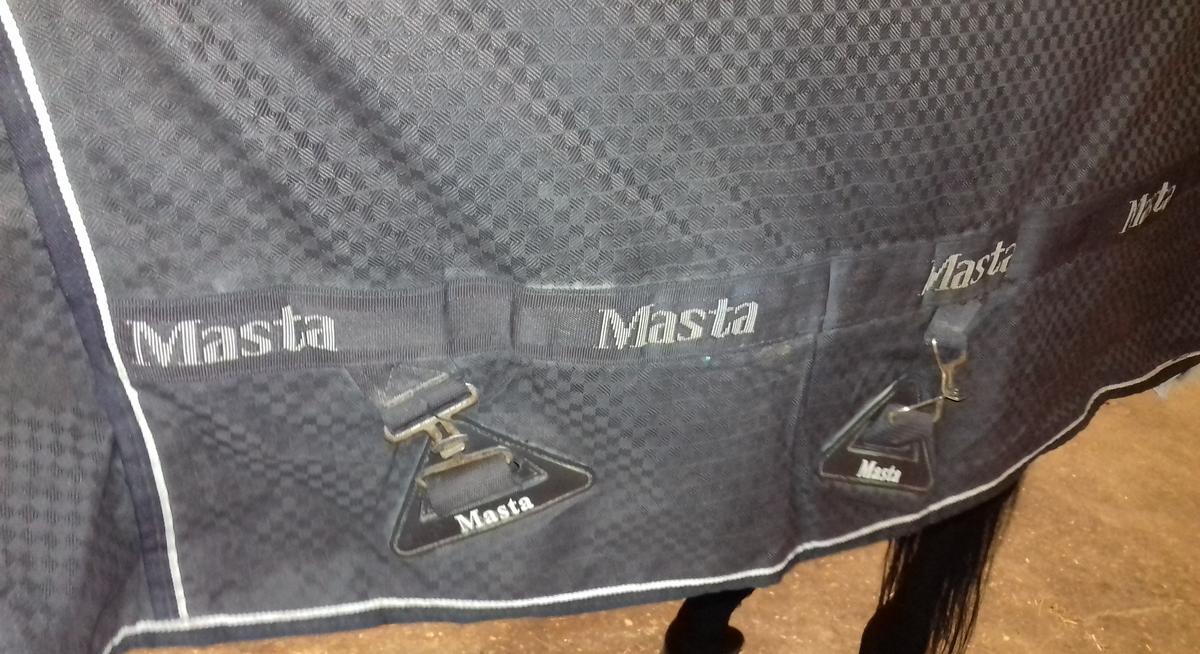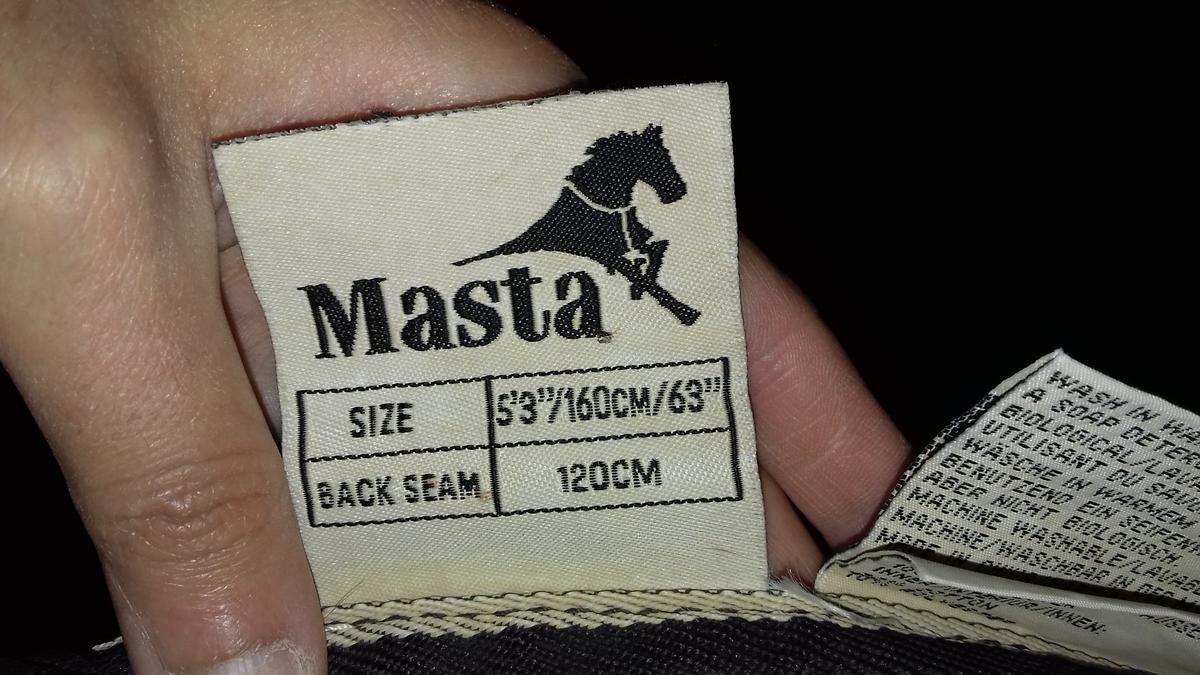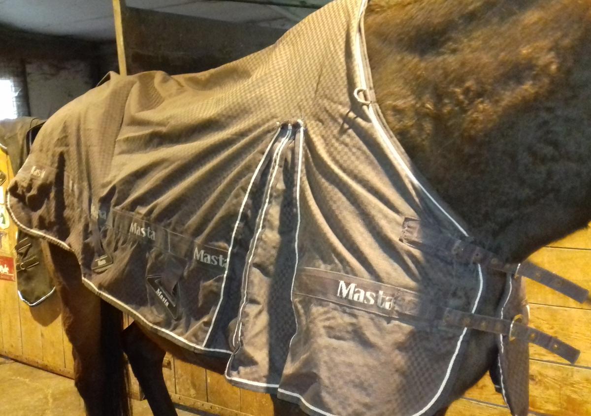 Couverture imperméable marron pour cheval de marque Masta, de 160 cm (longueur dos 120 cm) 5'3 de taille comme mentionné sur l'étiquette.