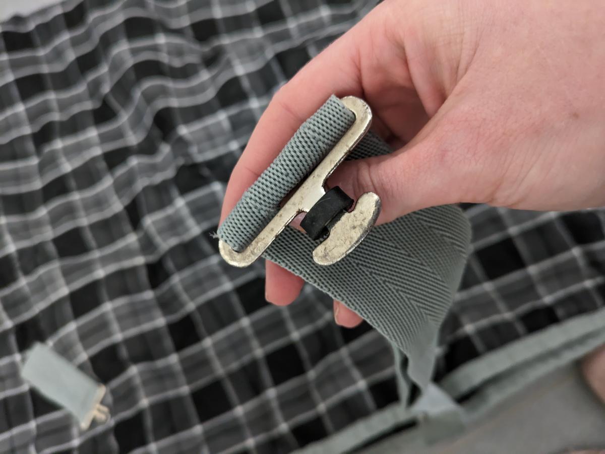 La couverture a été abîmé sur un endroit et recousu ( photo présente sur l'annonce). Les courroies de cuisse sont incluses.