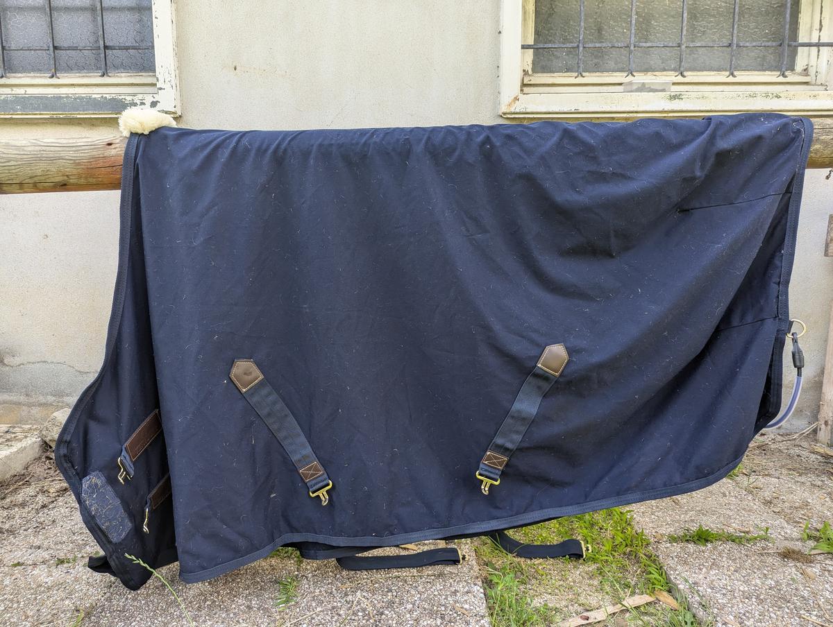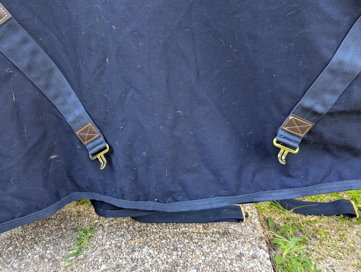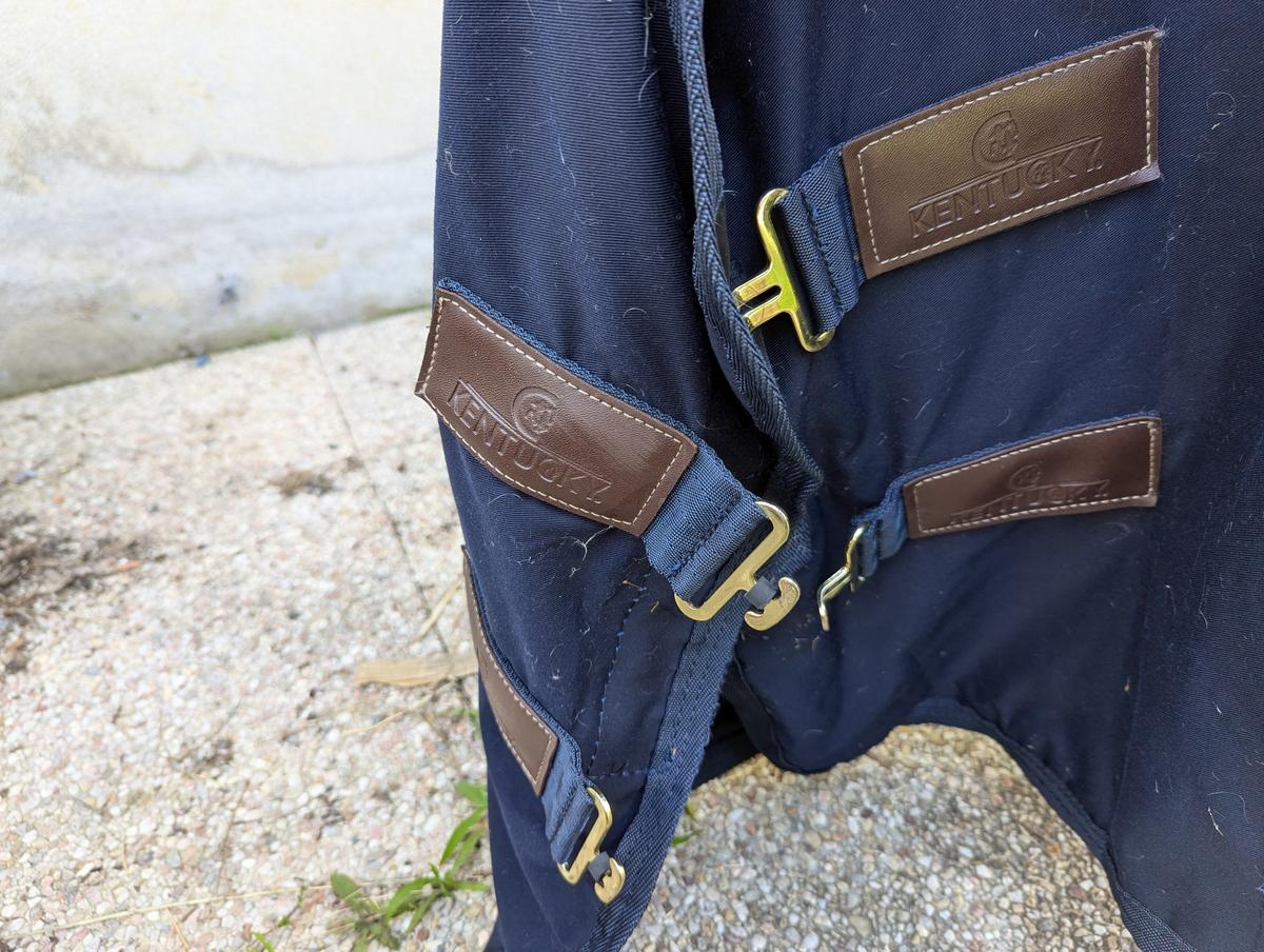 Courroie de queue, deux sangles ventrales, deux attaches poitrail avec scratch. Le scratch a légèrement ébouriffé la bordure.