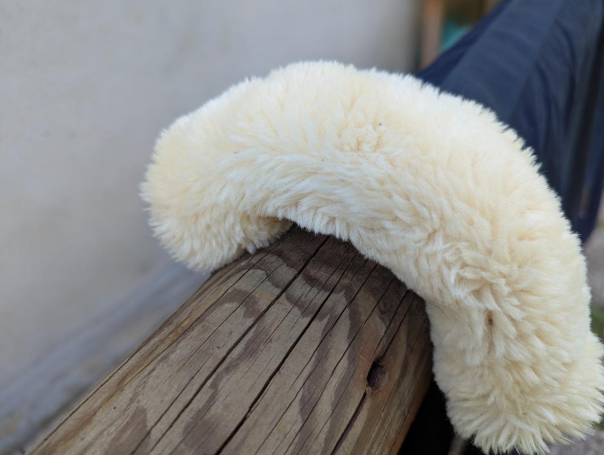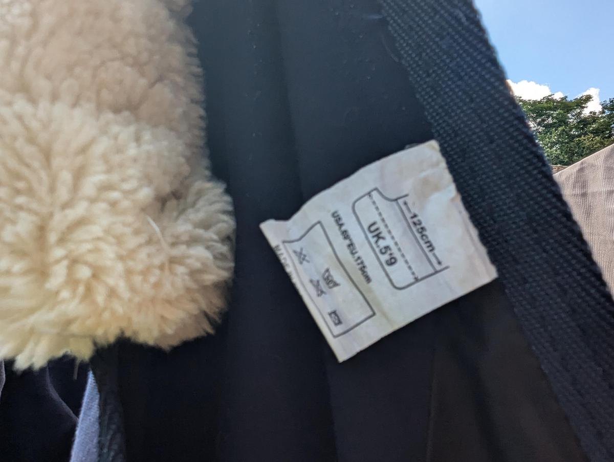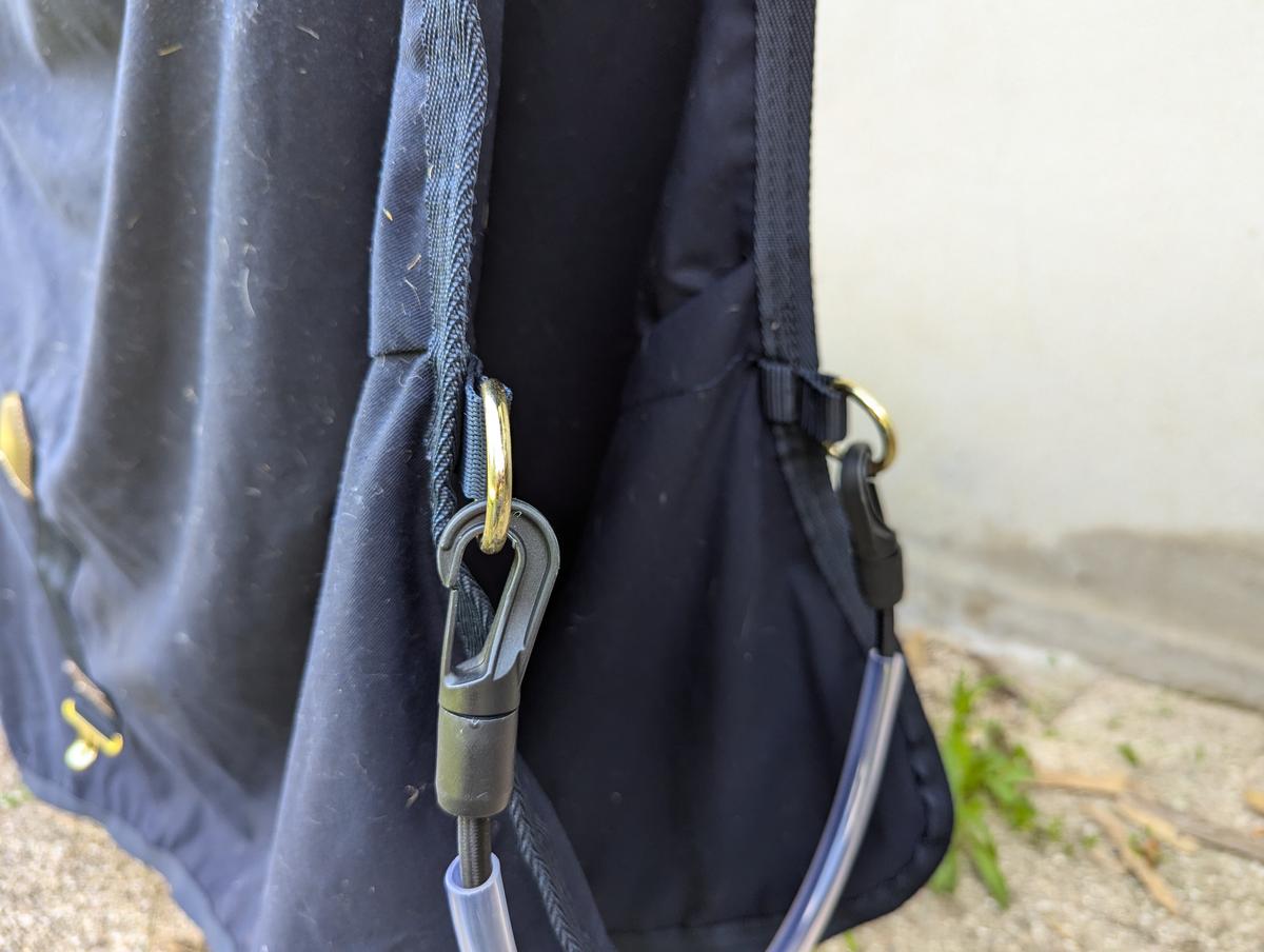Courroie de queue, deux sangles ventrales, deux attaches poitrail avec scratch. Le scratch a légèrement ébouriffé la bordure.
