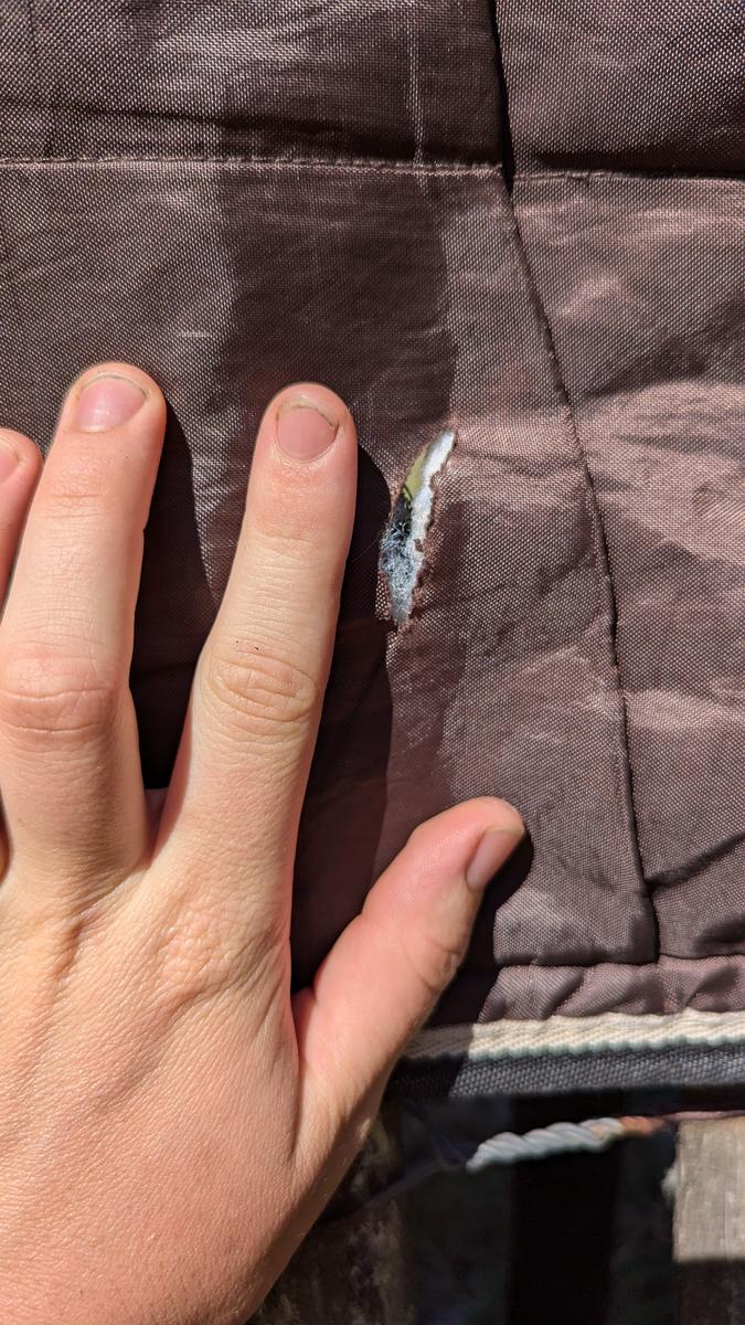 Utilisé. 1 trou et une déchirure.