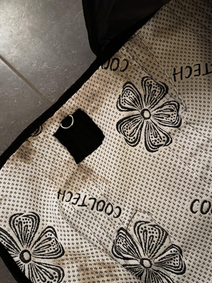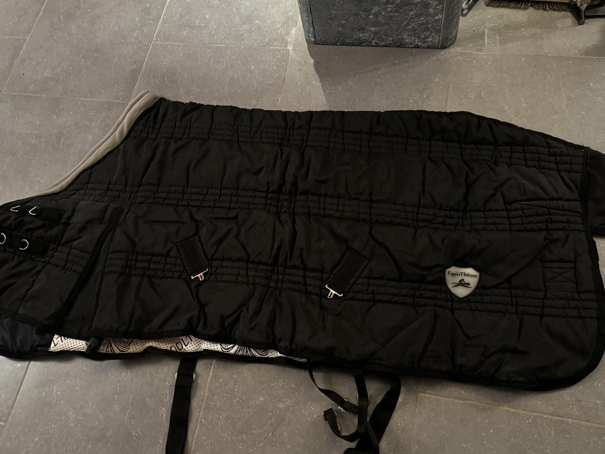 Couverture d'écurie Equi-thème cooltech. En très bon état, présence de taches sur l’arrière mais ne gênent en rien l’utilisation. Doublure entièrement en nid d’abeilles qui régule la température et absorbe l’humidité. ‼️taille grand, convient plus à un 135 bien musclé ou à un 145 assez fin je pense.