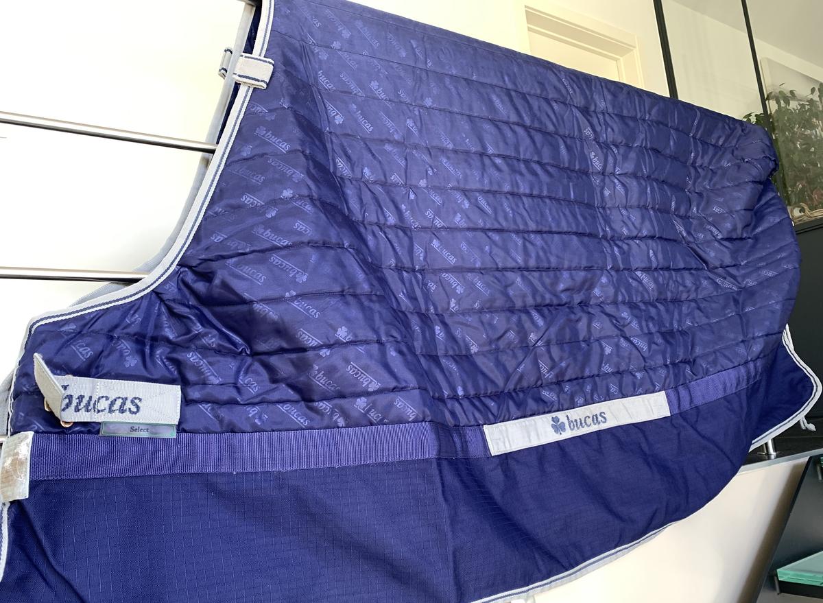 Couverture Select Quilt 300 gr couleur marine de chez Bucas taille 145. Peut être utilisé comme couverture de box ou comme sous-couverture. Fabriquée en nylon, résistant aux salissures, bas de la couverture en tissu hydrofuge. Simple fermeture poitrail. Sangles ventrales peuvent être utilisées de manière assez variable comme sangles ventrales ou comme sursangles croisées et sont élastiques et amovibles. En parfait état, très peu servi. Prix négociable