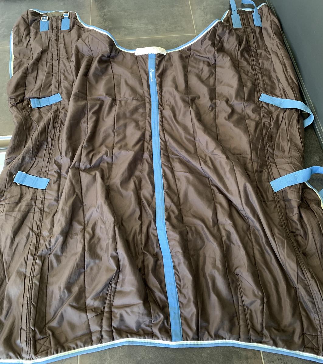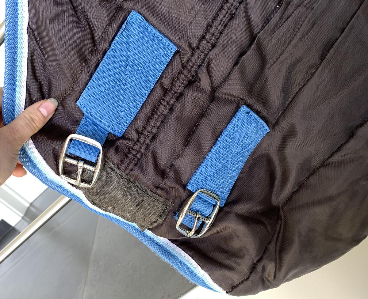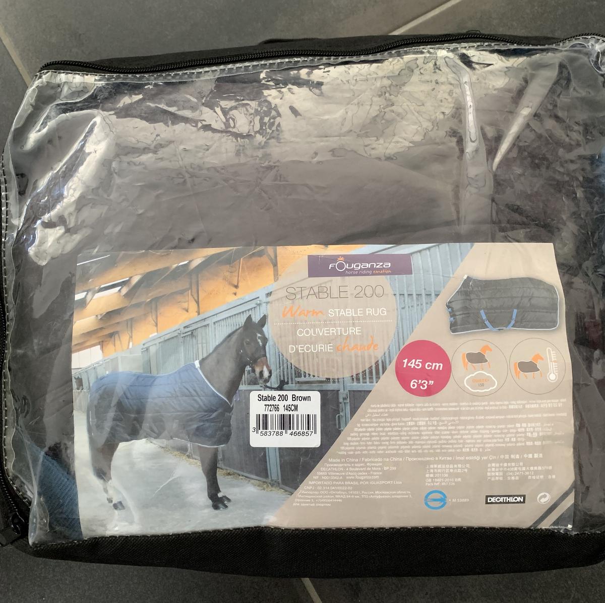 Couverture de box 200gr, taille 145, couleur : marron et bleu. Sangles ventrales amovibles. Courroie de cuisse à l'arrière. Très bonne état. Prix négociable