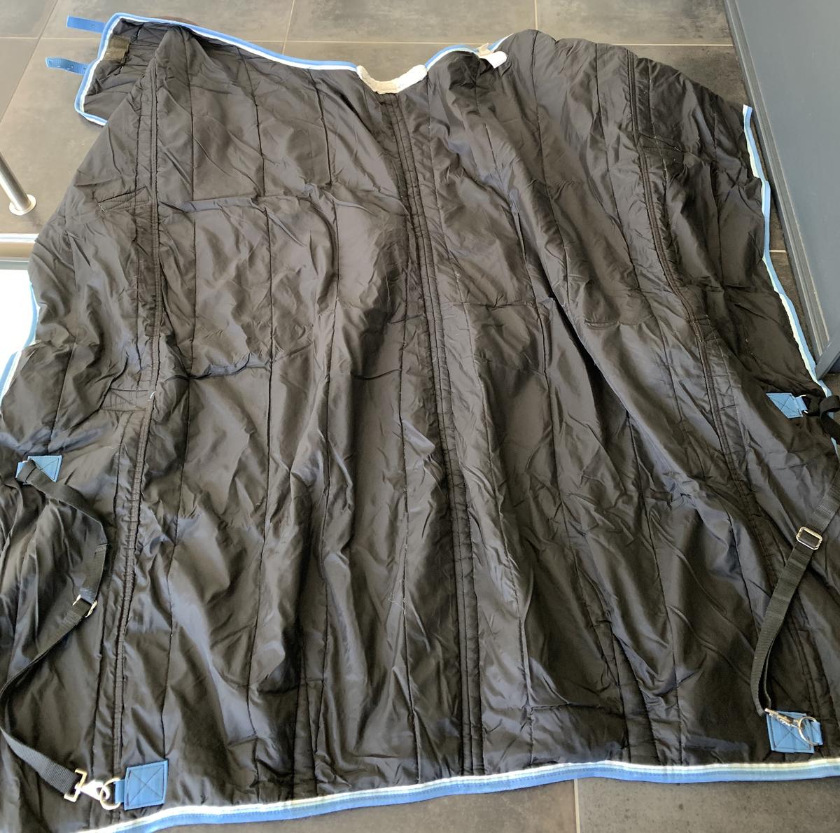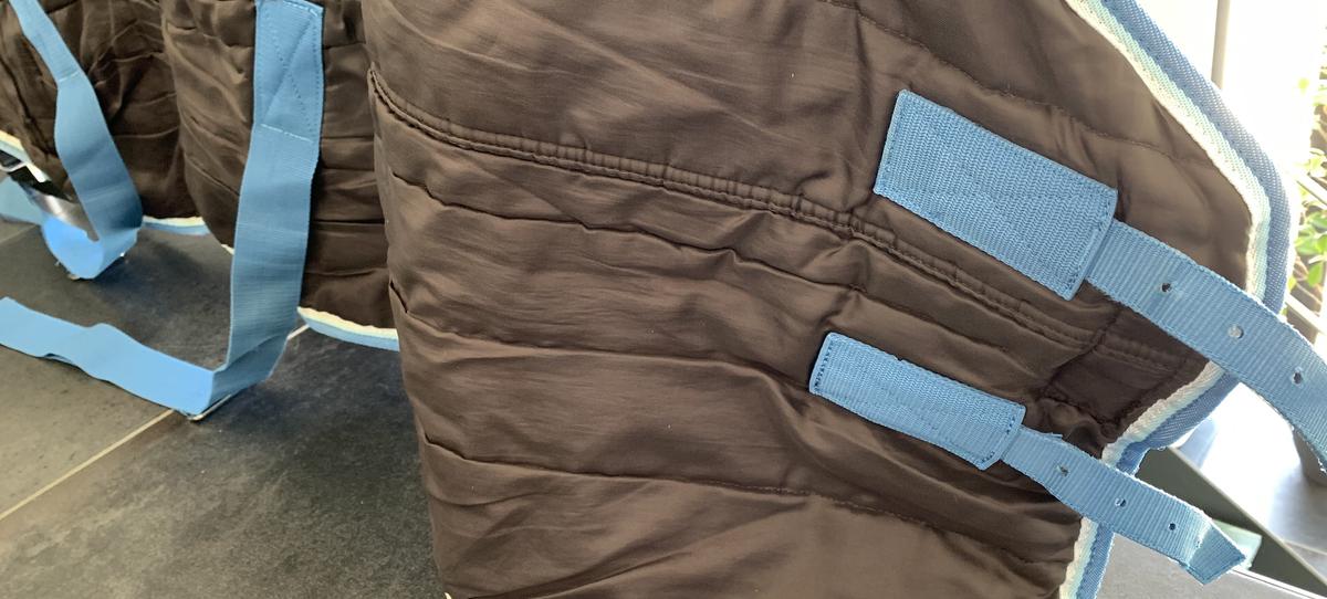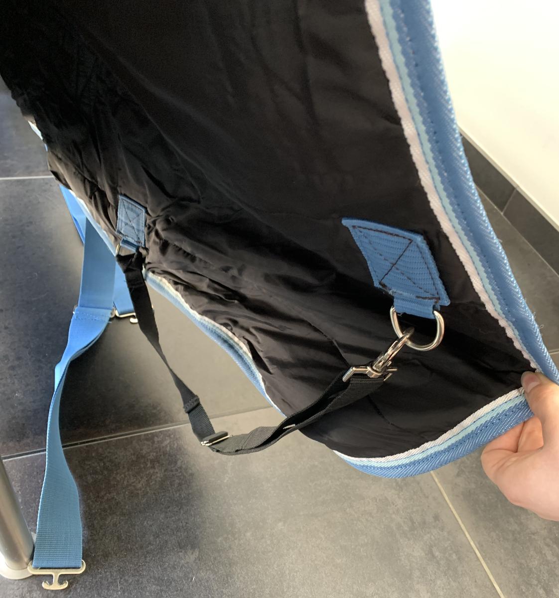 Couverture de box 200gr, taille 145, couleur : marron et bleu. Sangles ventrales amovibles. Courroie de cuisse à l'arrière. Très bonne état. Prix négociable
