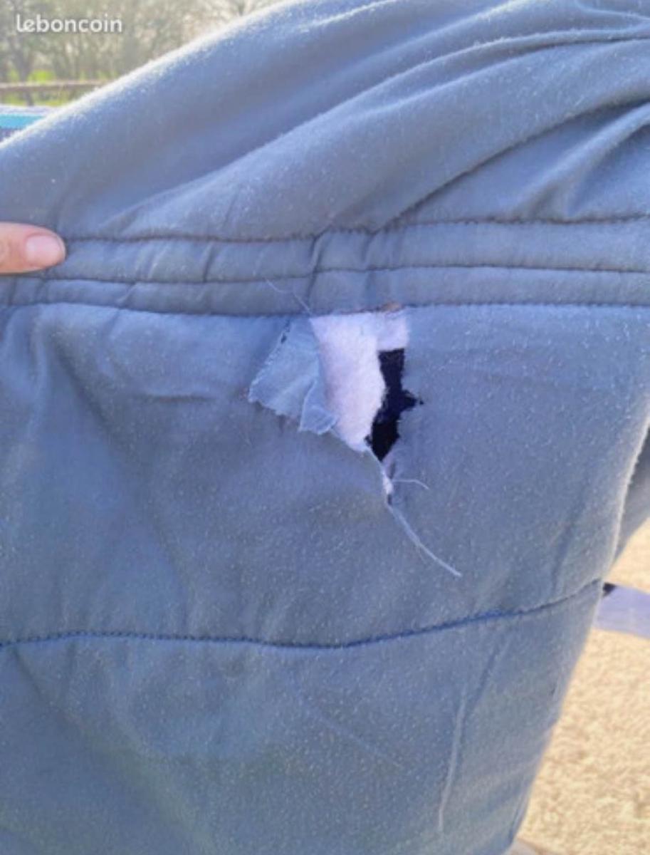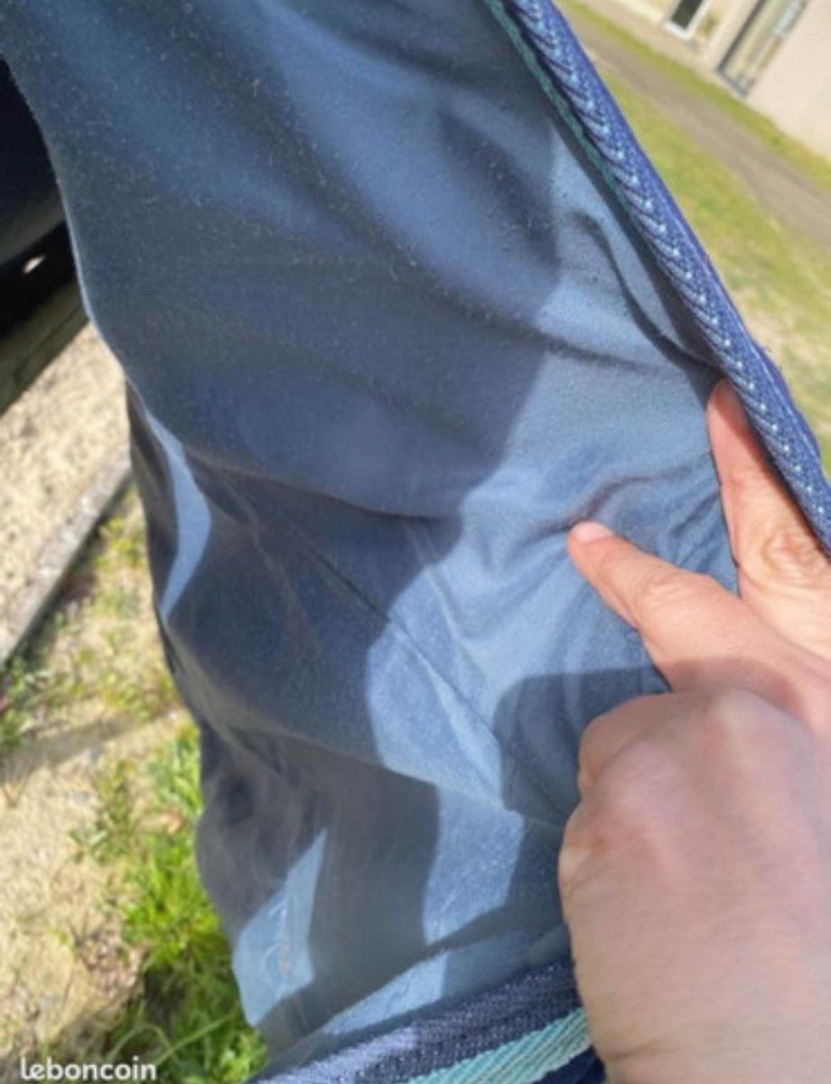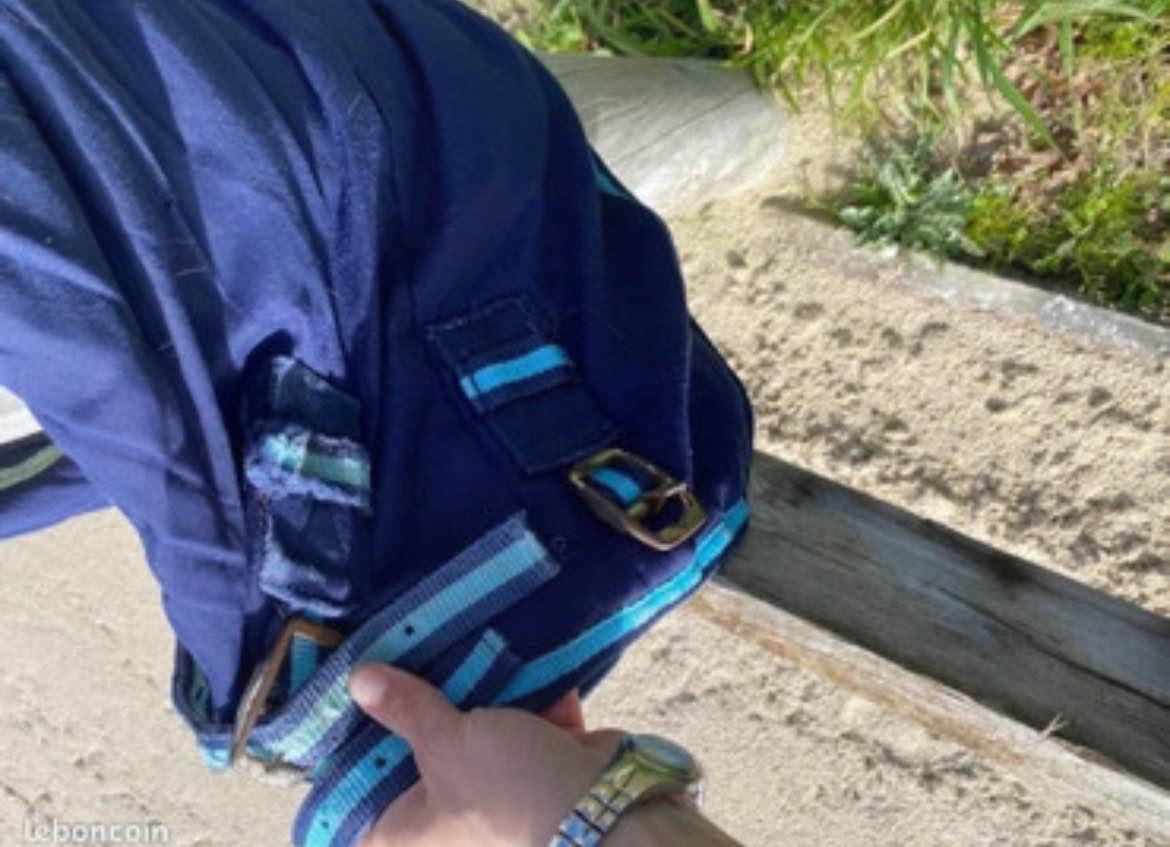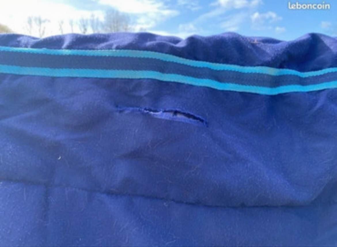 Couverture taille cheval (155 sur la ligne du dos, 195 de long). Vendue en l’état. À recoudre à deux endroits (photos).