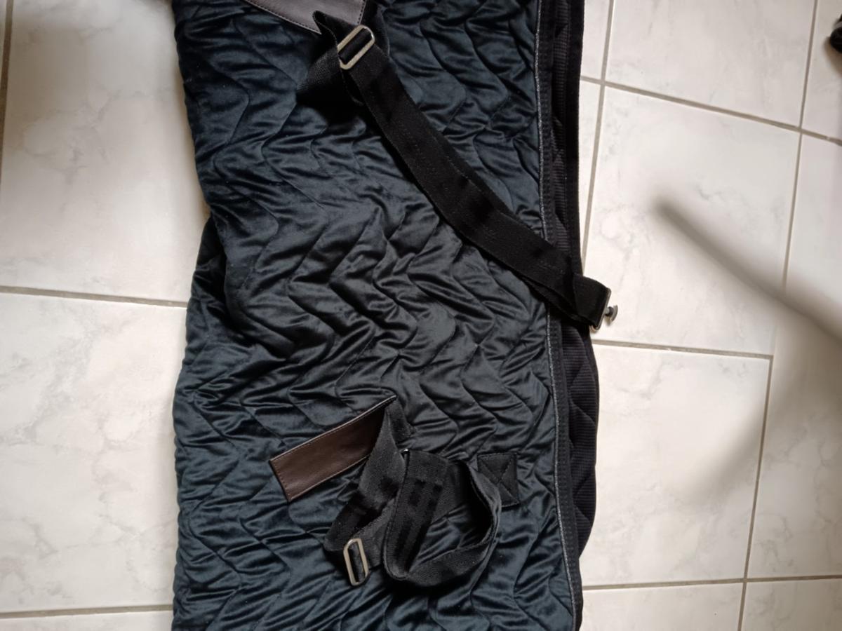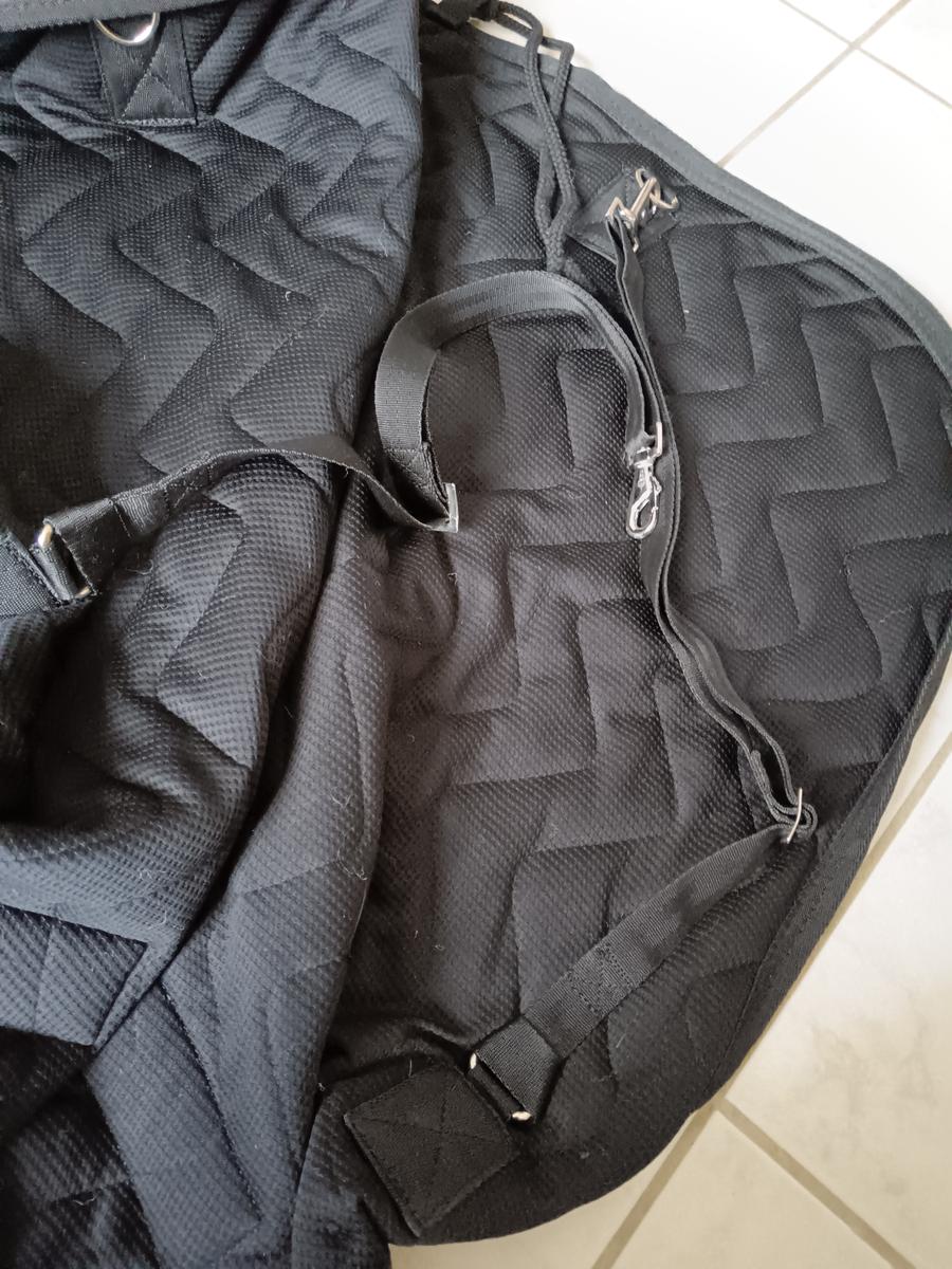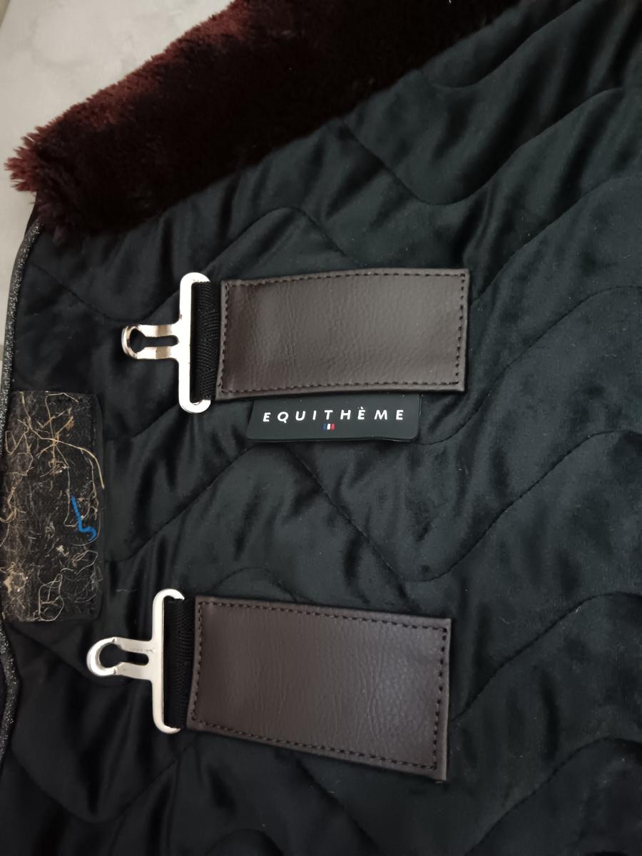 Couverture d'écurie pour cheval au box, marque Equitheme. Taille 145 (6"3). Modèle "Teddy" en velours, couleur noir & marron. État neuf car littéralement utilisée 3 fois. Les sangles et courroies sont en parfait état. Elle est épaisse et rembourrée (150g).