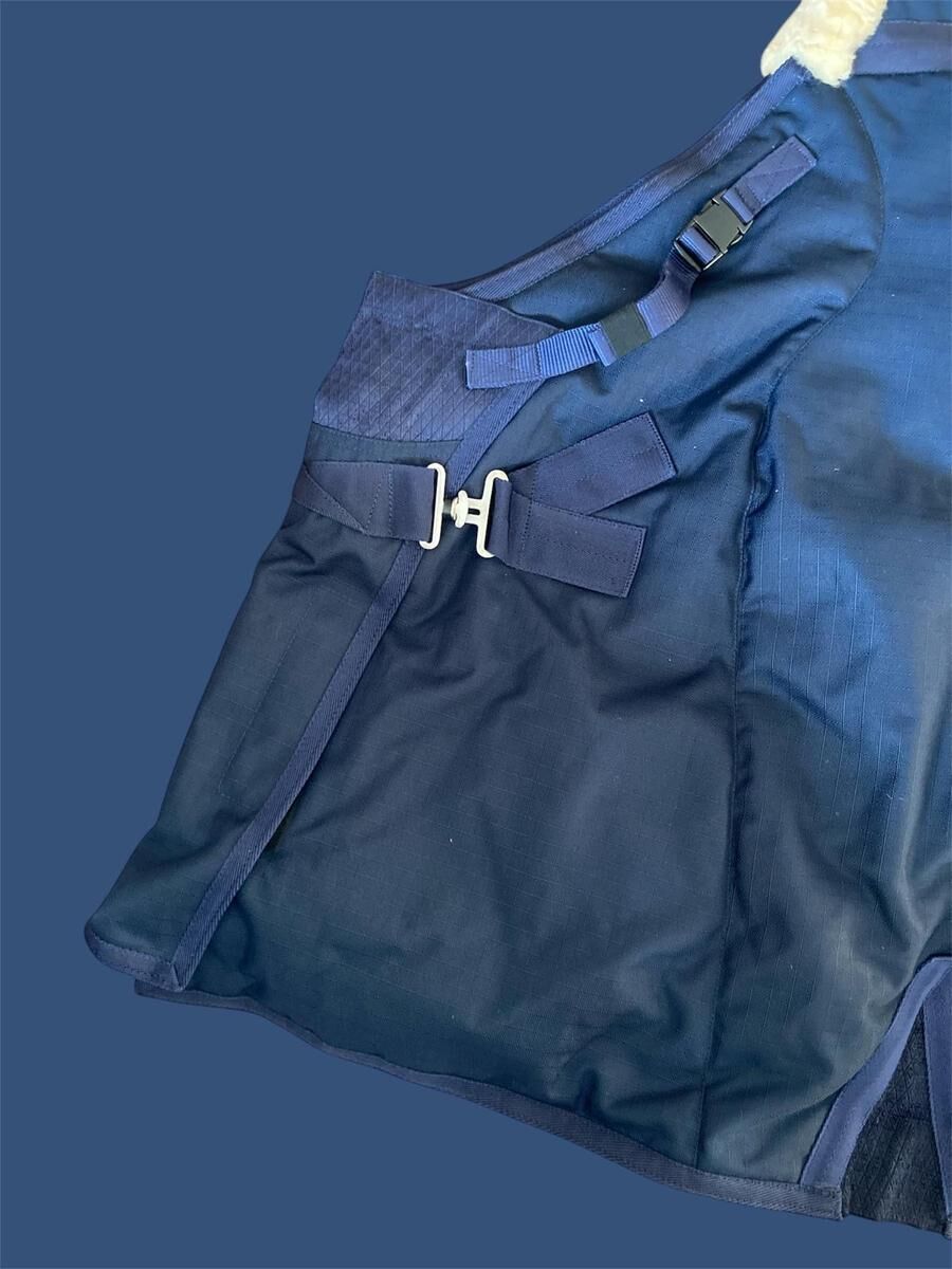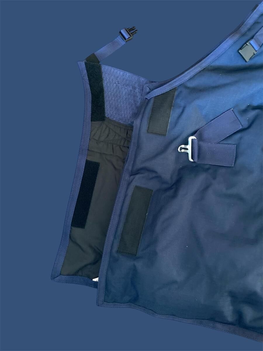 La couverture offre un confort exceptionnel grâce à son avancée sur l'encolure avec protection en mouton synthétique et sa découpe exclusive "V-neck" au garrot qui assure une grande liberté de mouvement. Elle est équipée de sangles croisées sous le ventre, de sous-cuisses amovibles et d'une fermeture au poitrail avec empiècement amovible et large partie élastique pour un ajustement parfait.