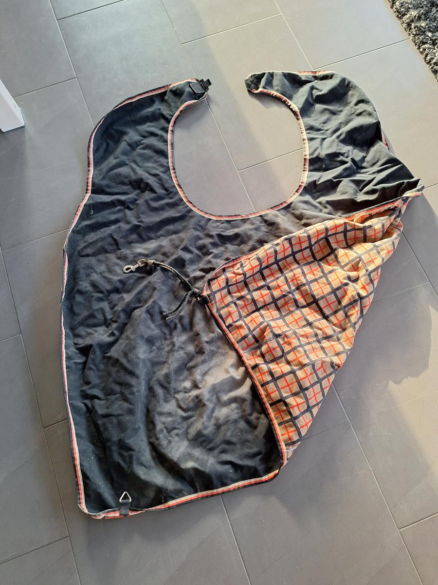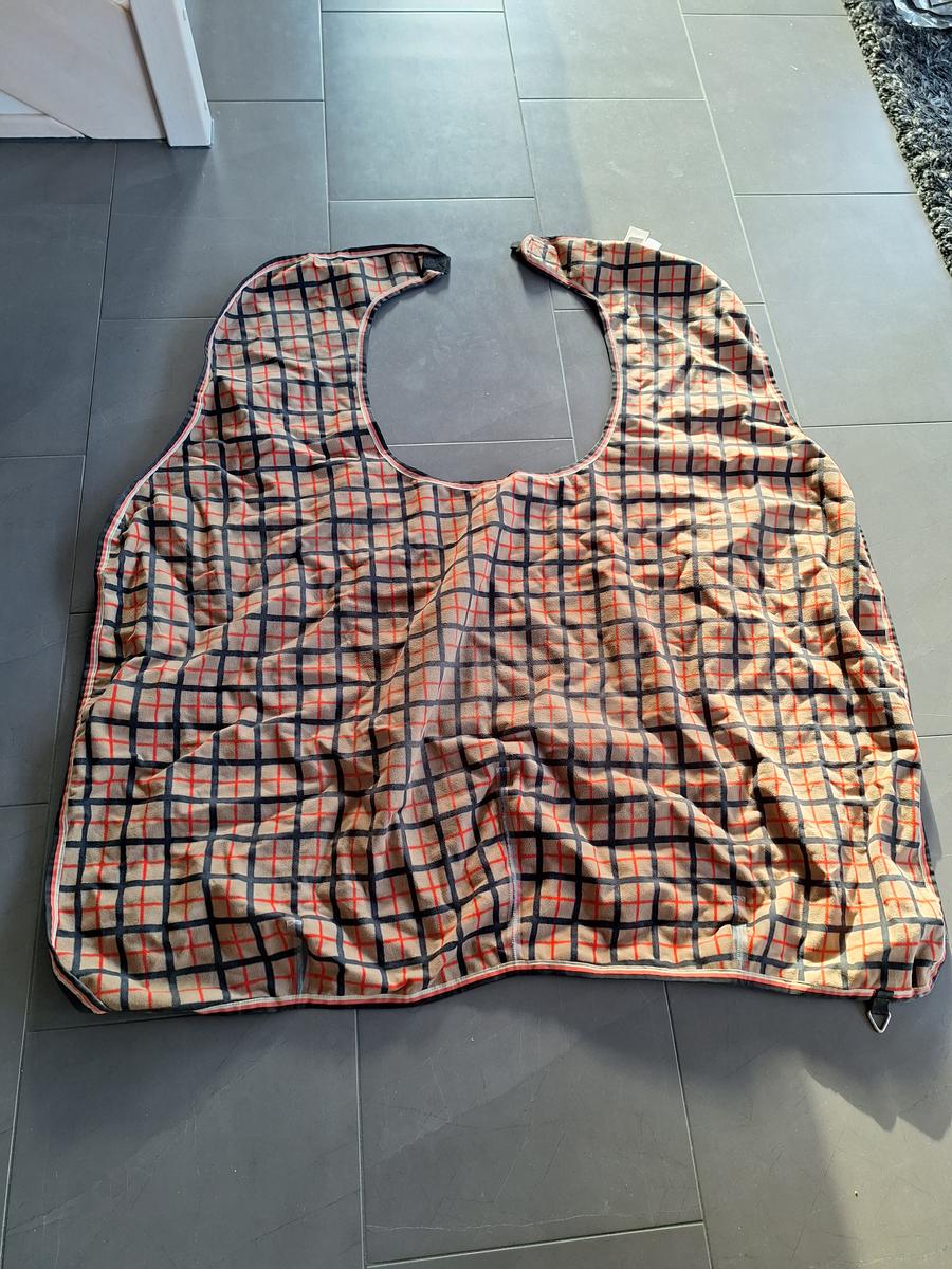 Magnifique imprimé à carreaux pour ce Coupe-Vent imperméable en matière polaire ras, protège les reins et les flancs, avec découpe pour selle, large patte auto-agrippante au niveau du garrot et rabat de queue avec courroie réglable.