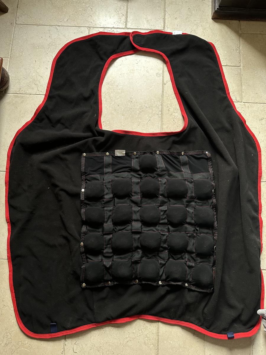 La spécialité est le pad (amovible) avec des boules massante qui, avec la friction, va chauffer plus rapidement le dos de votre cheval. Cheval plus vite disponible et souple.