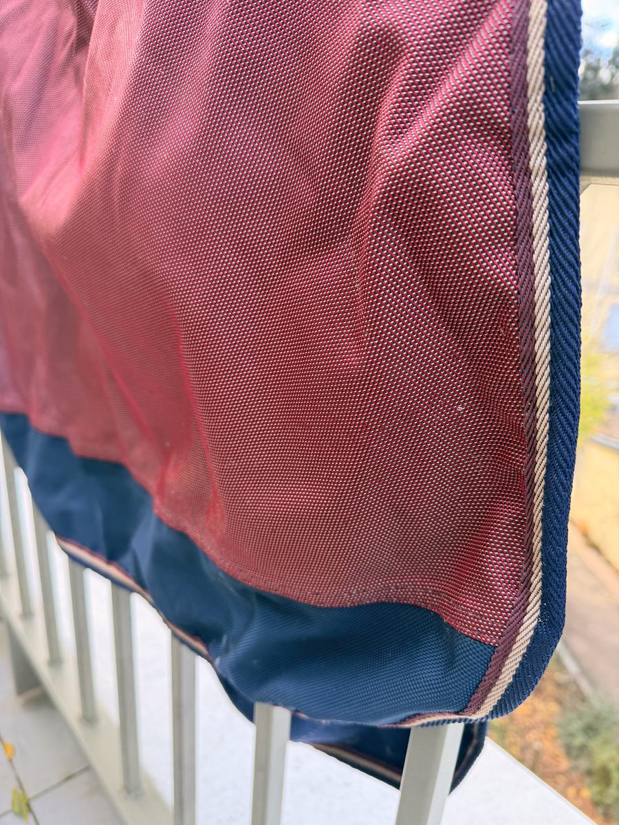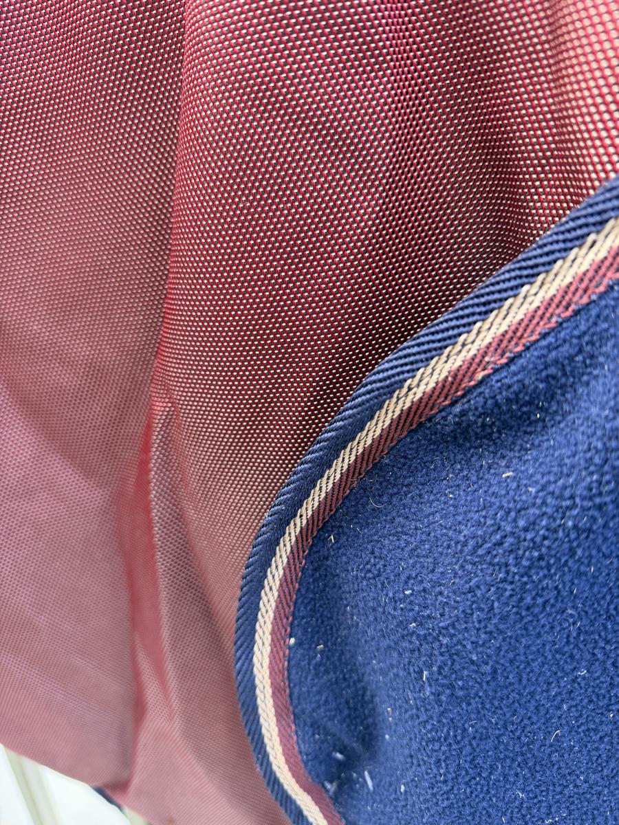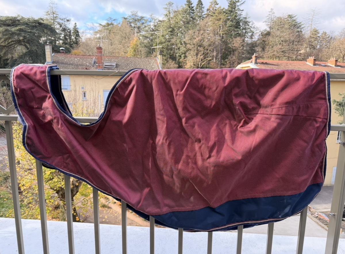 Élégant et pratique, ce couvre-rein bicolore bordeaux et bleu marine est parfait pour protéger votre poney par temps frais ou humide :