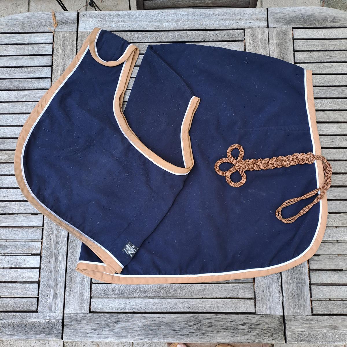 Polaire marine, bord camel et galon blanc