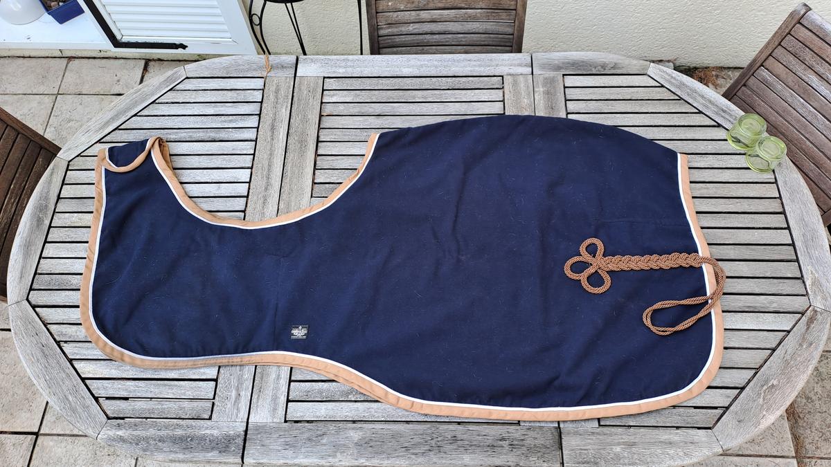 Polaire marine, bord camel et galon blanc