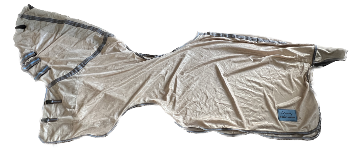 Couvre-reins léger avec couvre-cou. Découpe pour une selle anglaise. Couvre-cou avec 3 pattes auto-agrippantes et languette élastique pour une fixation à la têtière du bridon. Doublure en nylon au poitrail et à la crinière afin de limiter les frottements et la perte de poils. Avec rabat de queue et fermetures à clips au poitrail. 100 % polyester.