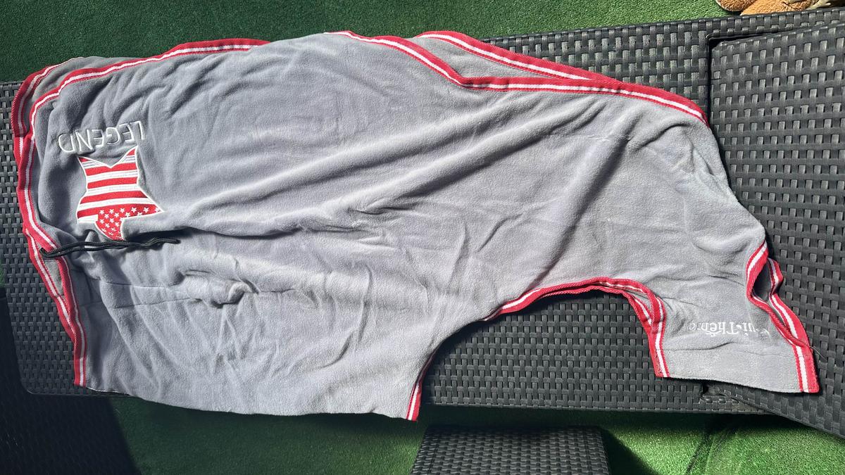 Couvre rein polaire Equitheme gris et rouge, porté qu’une fois en très bon état. Taille poney (125cm)