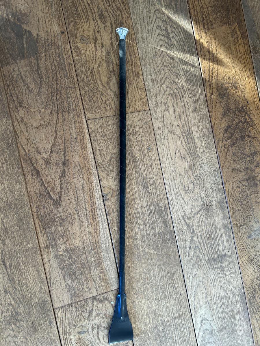 Cravache noire bout métallique côté cavalier.
