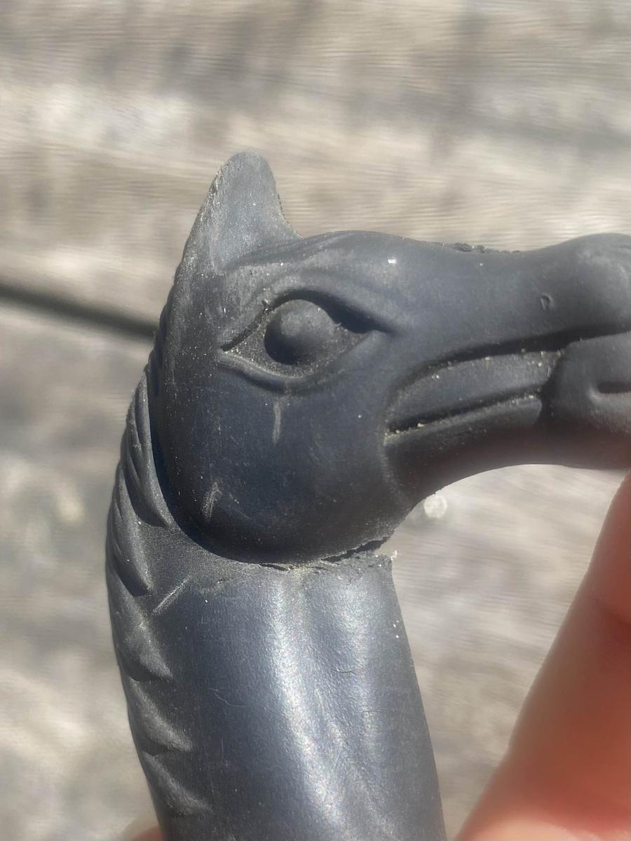 Cravache avec une tête de cheval et une main de l'autre côté.