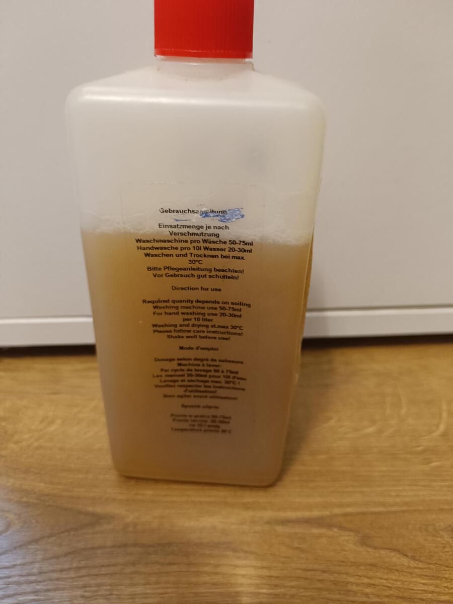 Toujours très bien entretenue avec les produits fournis par la marque. Vendu avec la lessive dédiée (voir photo).