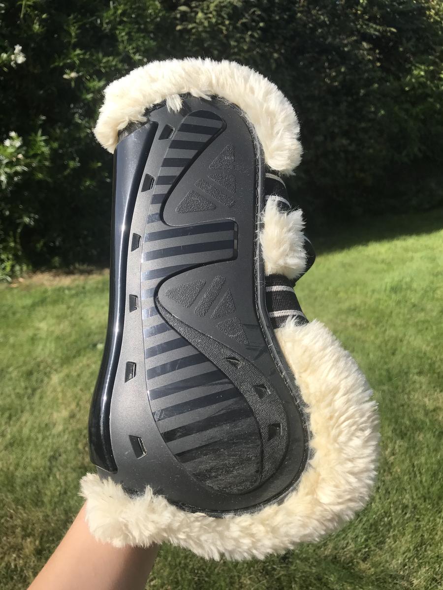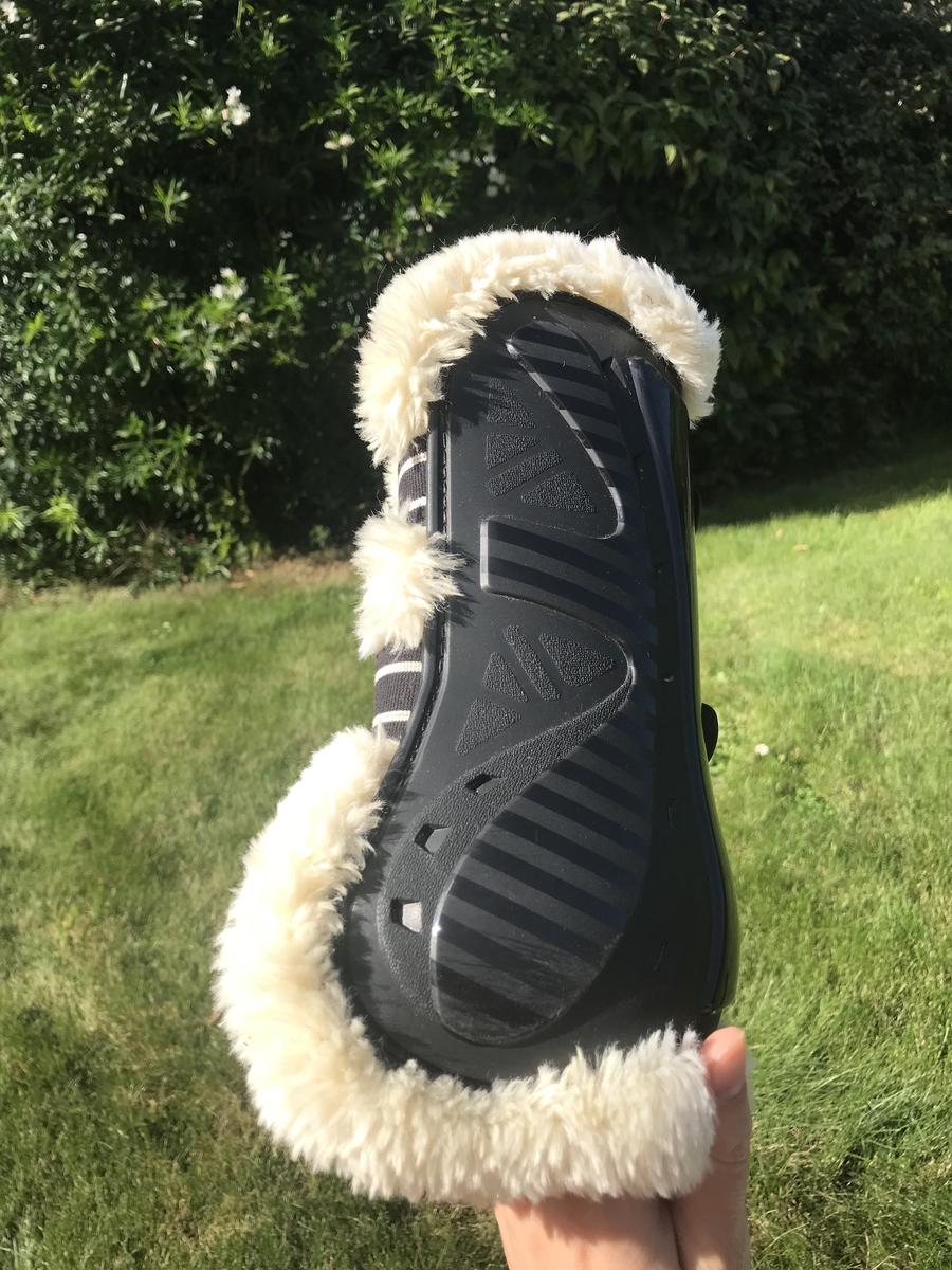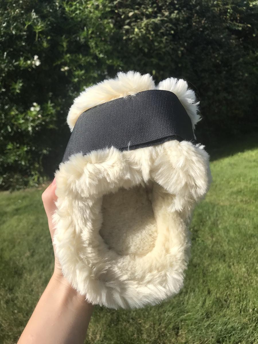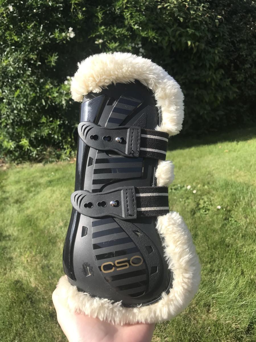 Ensemble guêtres et protèges boulets CSO en mouton synthétique, acheté d'occasion puis jamais utilisé car trop grand.