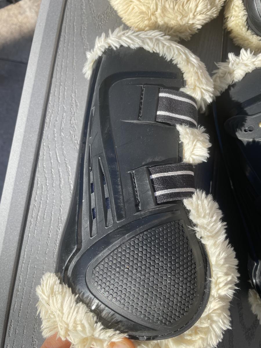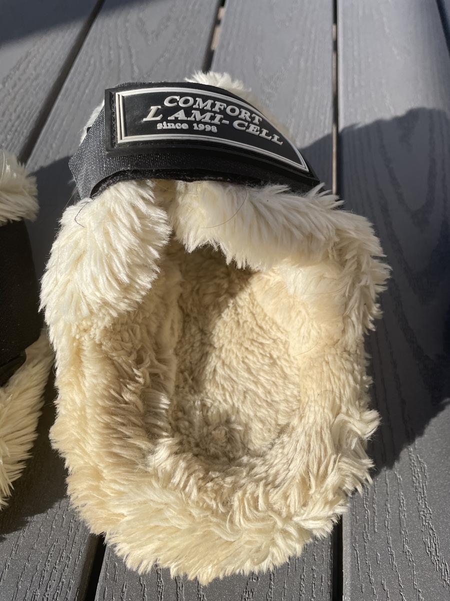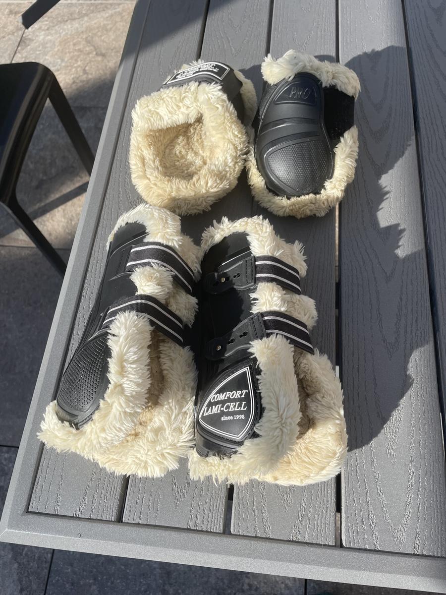 Lot de feutres et protèges-boulets lamicell noir en mouton synthétique beige. Utilisé lors d’une seule saison à raison de 1 concours par mois. Comme les photos le montre il n’y a aucun trace d’usure sur les guêtres et protèges-boulets. Le mouton est de super qualité ! Taille cheval. Guêtres neuves prix -> 83€ et protèges-boulets -> 55€