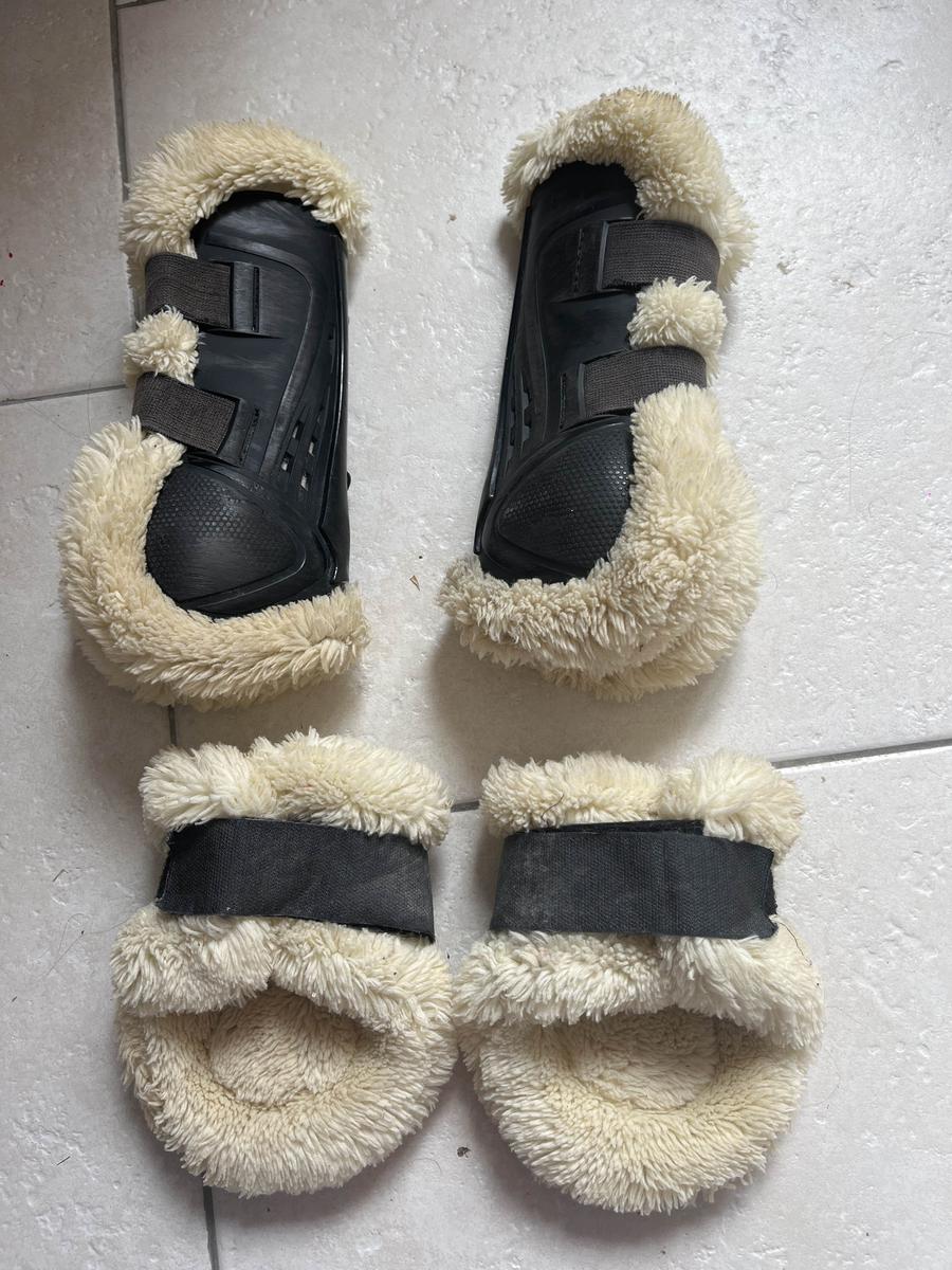 Guêtre et protège boulet XTR mouton, utilisé plusieurs fois mais lavé après chaque utilisation, les guêtres ainsi que les protège boulet sont en super état, taille poney