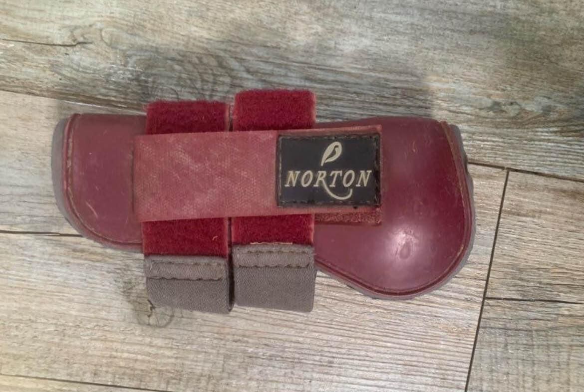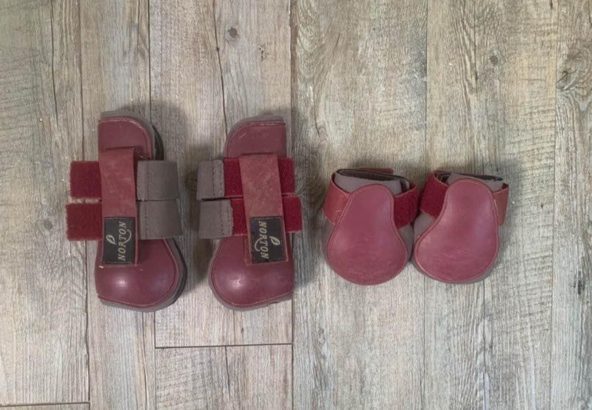 Guêtres ouverte et proteges boulets norton de couleur bordeaux. Taille poney, très bon état