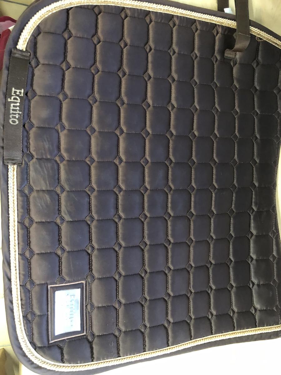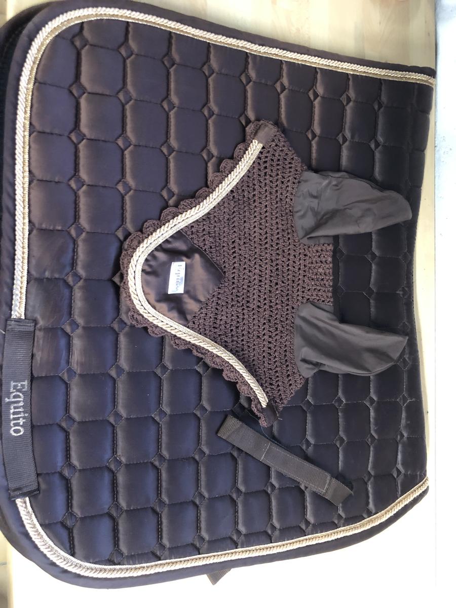 Ensemble tapis + bonnet Equito Equestrian en bon état comportant quelques petits défauts (visibles sur les photos). Marron et or , taille cheval