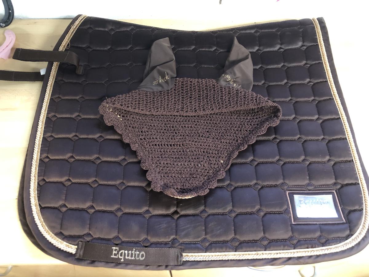 Ensemble tapis + bonnet Equito Equestrian en bon état comportant quelques petits défauts (visibles sur les photos). Marron et or , taille cheval