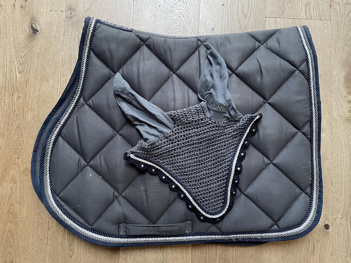 Ensemble tapis et bonnet gris et bleu marine sur les bords