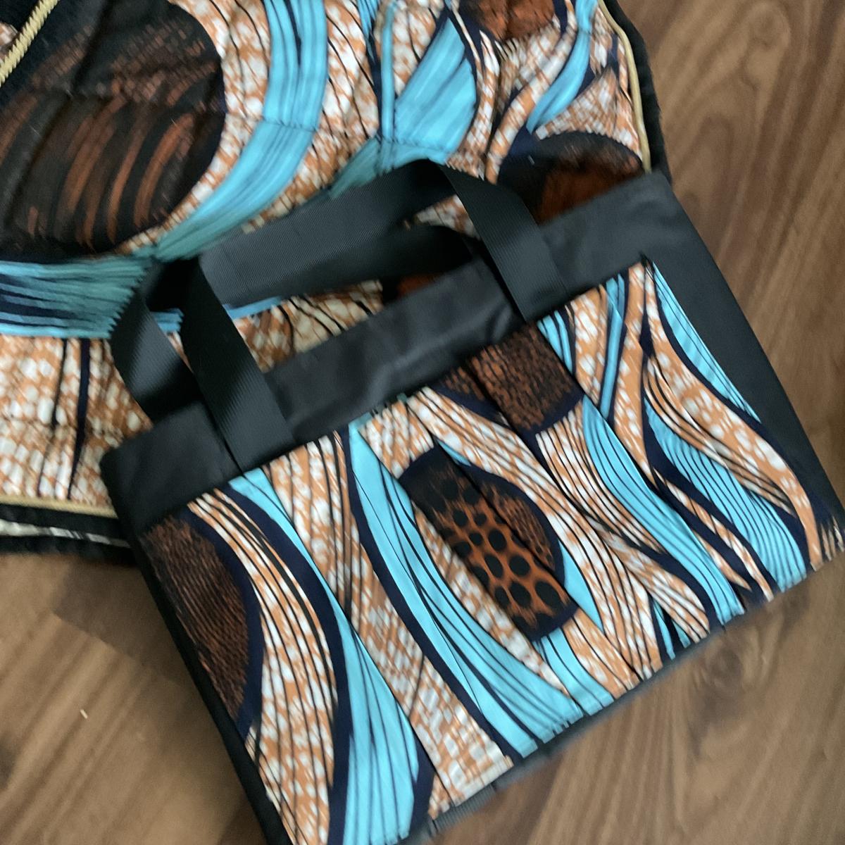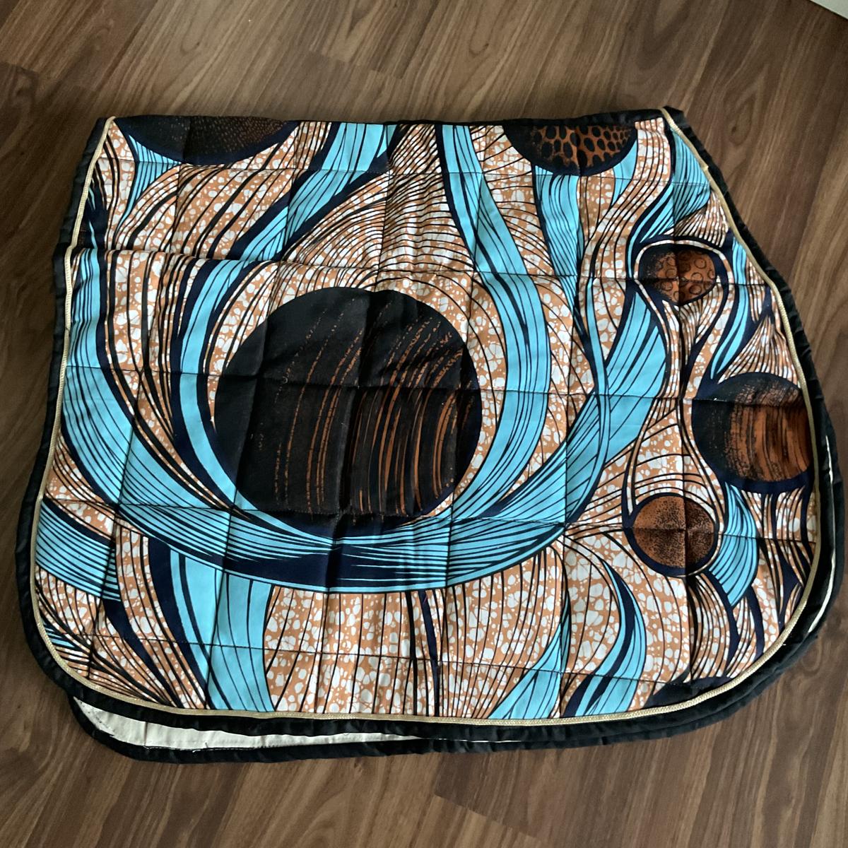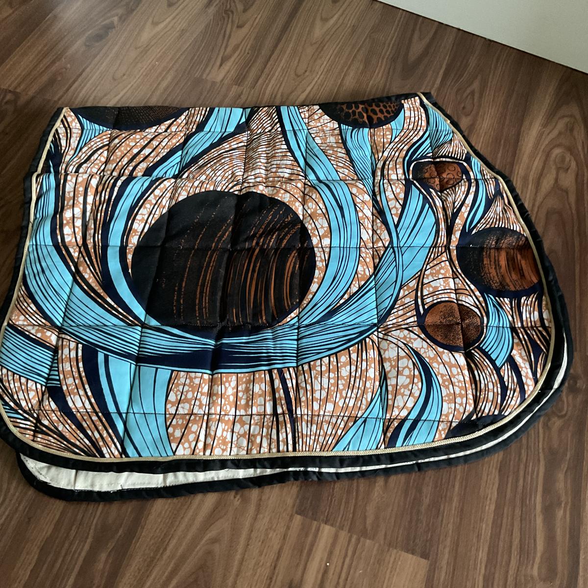 Il s’agit d’un ensemble composé d’un Tapis d’un bonnet et d’un sac de pansage, il convient très bien pour le dressage comme pour le saut le tapis est de très bonne qualité avec un tissu agréable il est facile à laver. Mais aussi le tissus est fait à base de pagne provenant du Burkina Faso en Afrique, il est fabriquer à la main. Cependant le tapis ne possède pas les attaches pour le passage de sangle.
