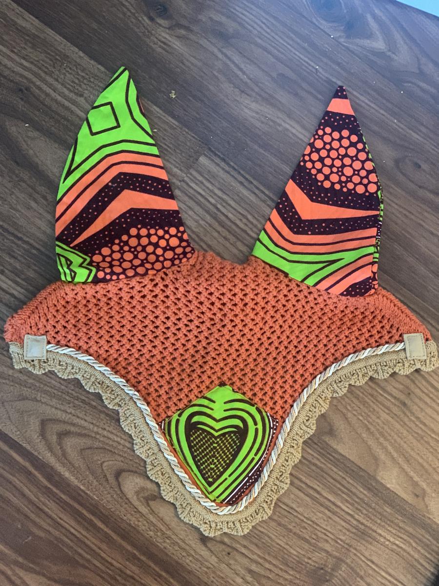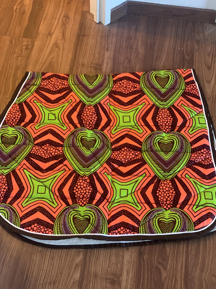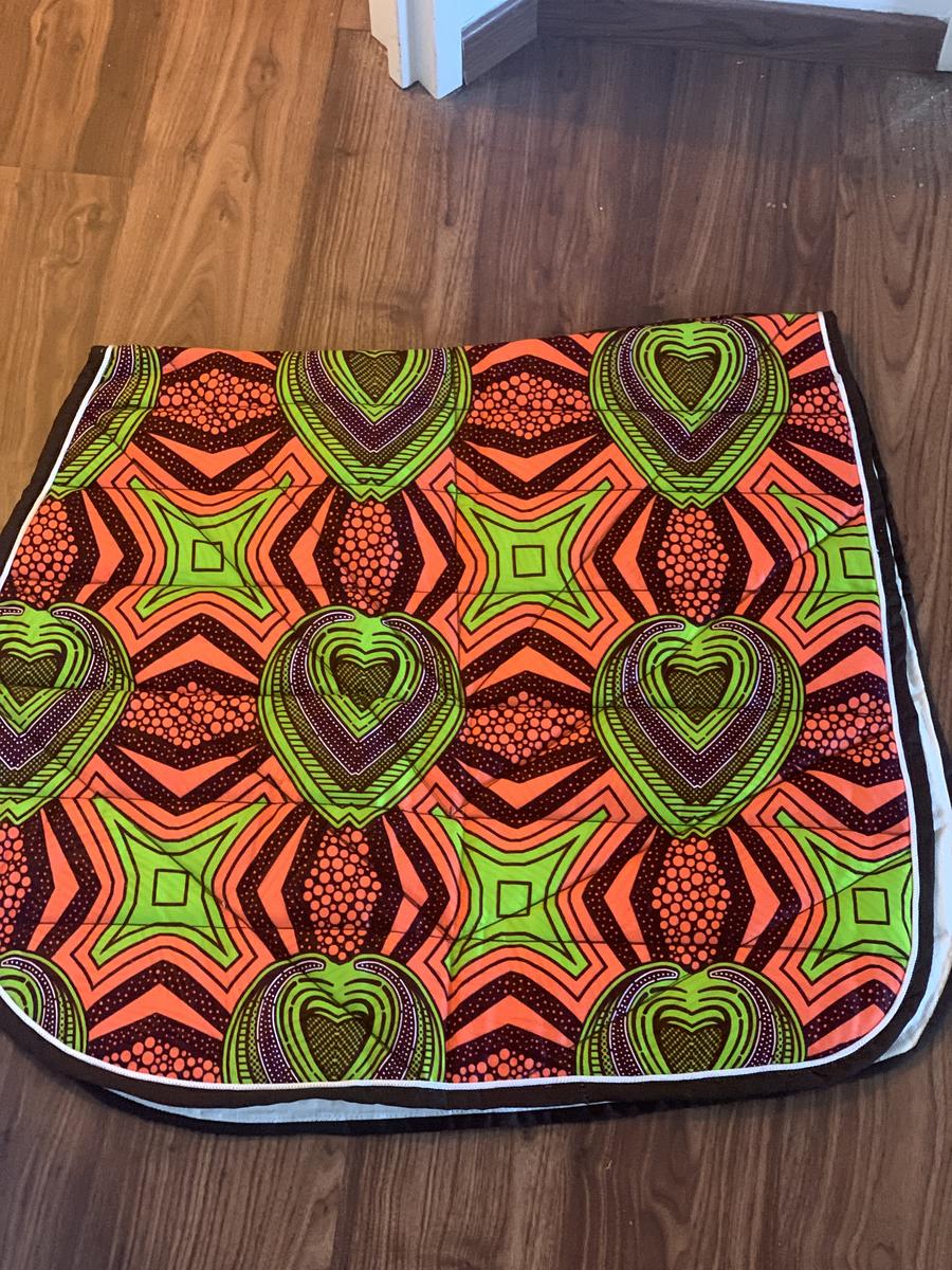 Il s’agit d’un ensemble composé d’un tapis, d’un bonnet et d’un sac de pansage, il convient très bien pour le dressage comme pour le saut le tapis est de très bonne qualité avec un tissu agréable il est facile à laver. Mais aussi le tissus est fait à base de pagne provenant du Burkina Faso en Afrique, il est fabriquer à la main. Cependant le tapis ne possède pas les attaches pour le passage de sangle.