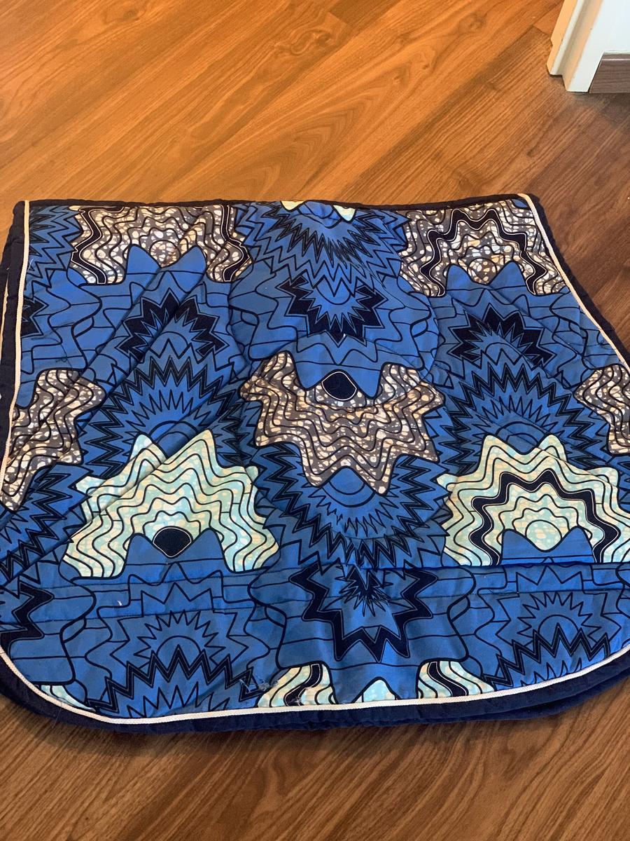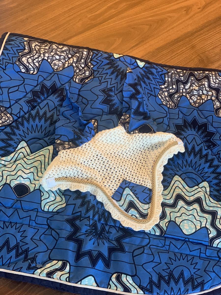 Il s’agit d’un ensemble composé d’un tapis et d’un bonnet, il convient très bien pour le dressage comme pour le saut le tapis est de très bonne qualité avec un tissu agréable il est facile à laver. Mais aussi le tissus est fait à base de pagne provenant du Burkina Faso en Afrique, il est fabriquer à la main. Cependant le tapis ne possède pas les attaches pour le passage de sangle.