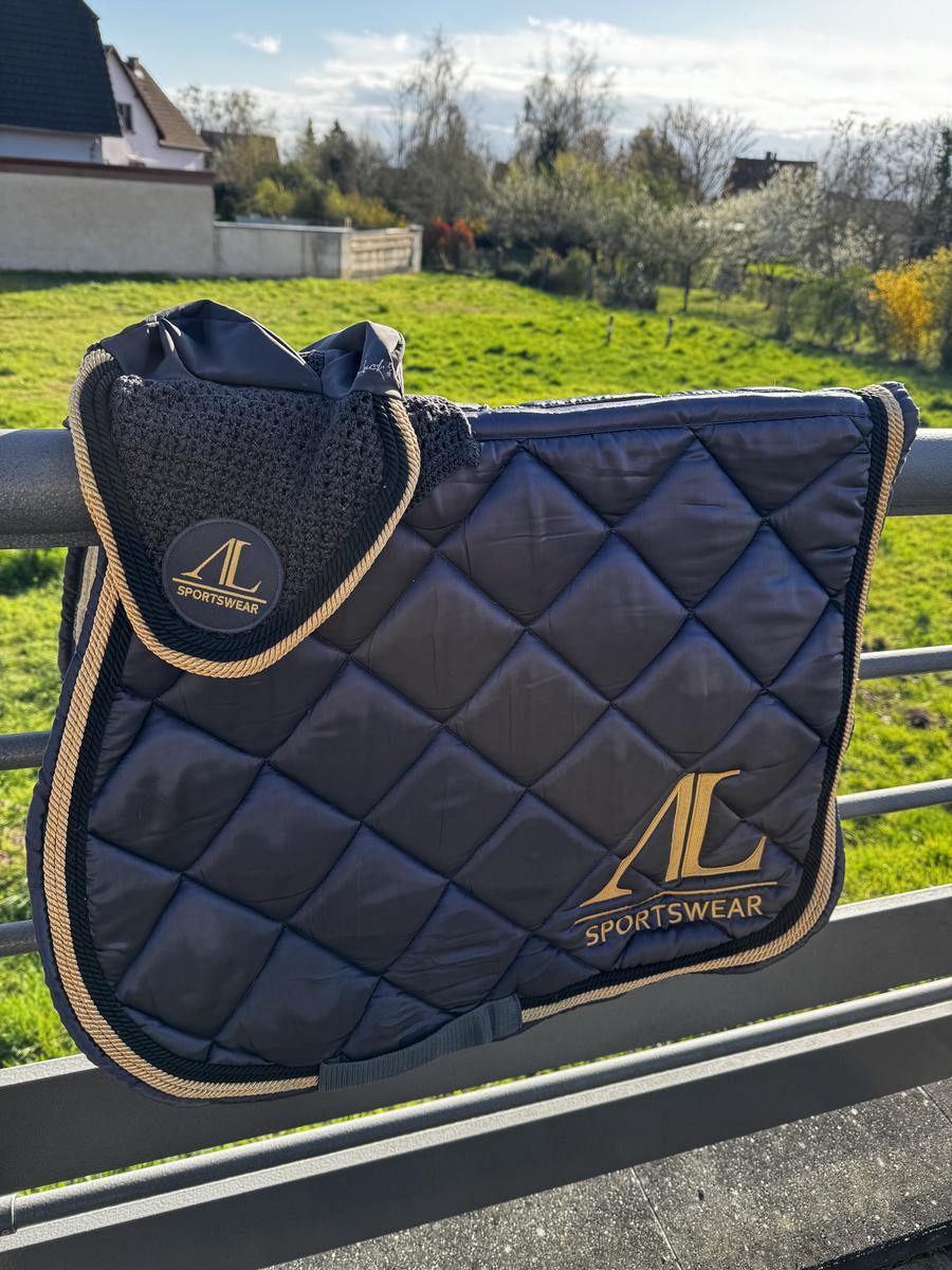 Tapis de selle satiné noir avec 4 cordelettes : 2 de couleur gris anthracite & 2 de couleur or. Logo AL doré sur un côté. Forme CSO.