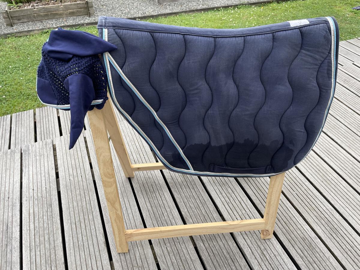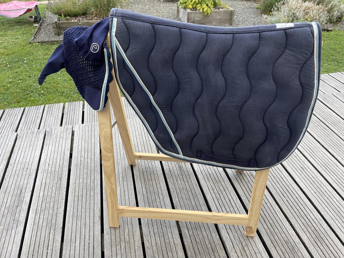 Lot tapis et bonnet de concours Equitheme bleu taille poney. Très bon état, n’a servi qu’une petite saison de concours. Le tapis a été brossé.