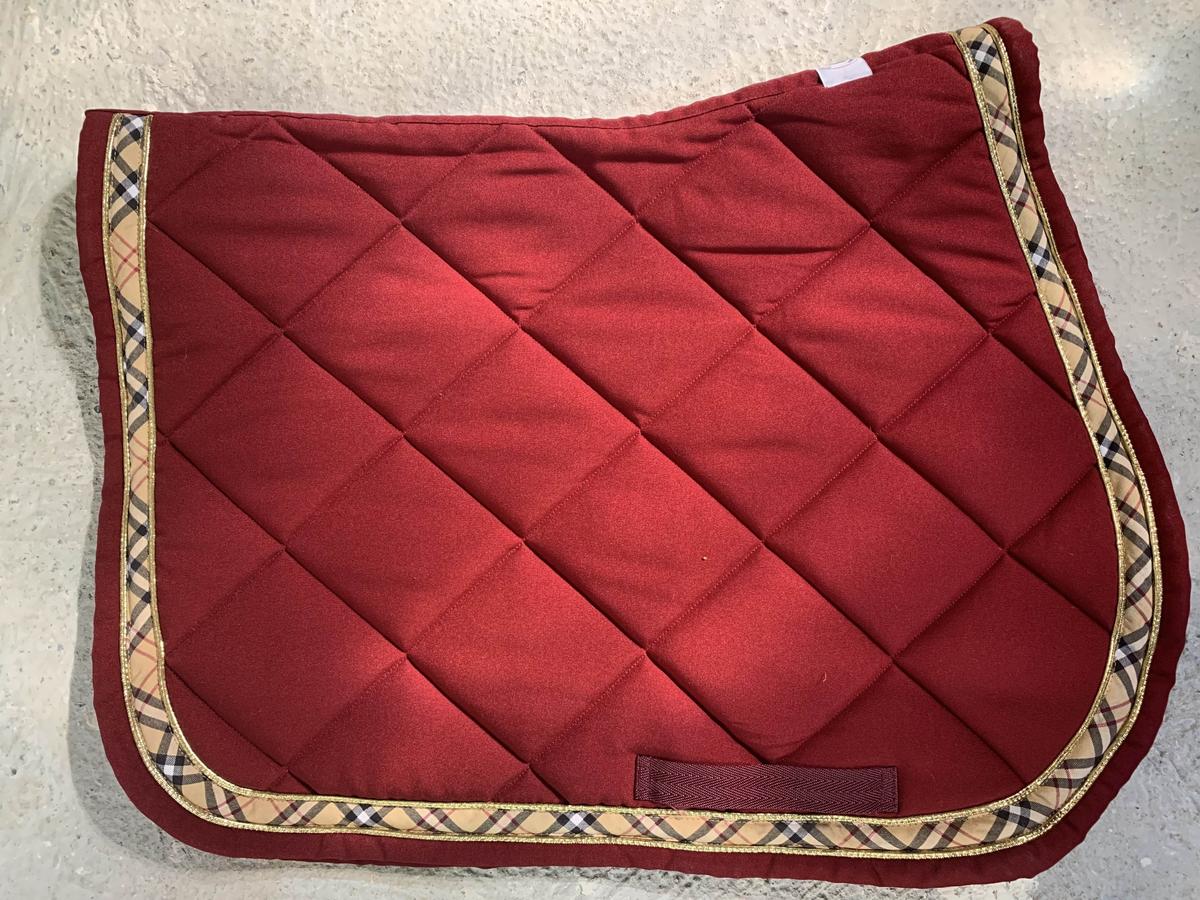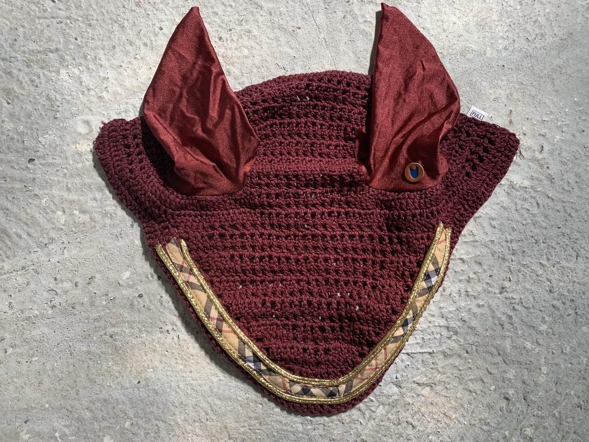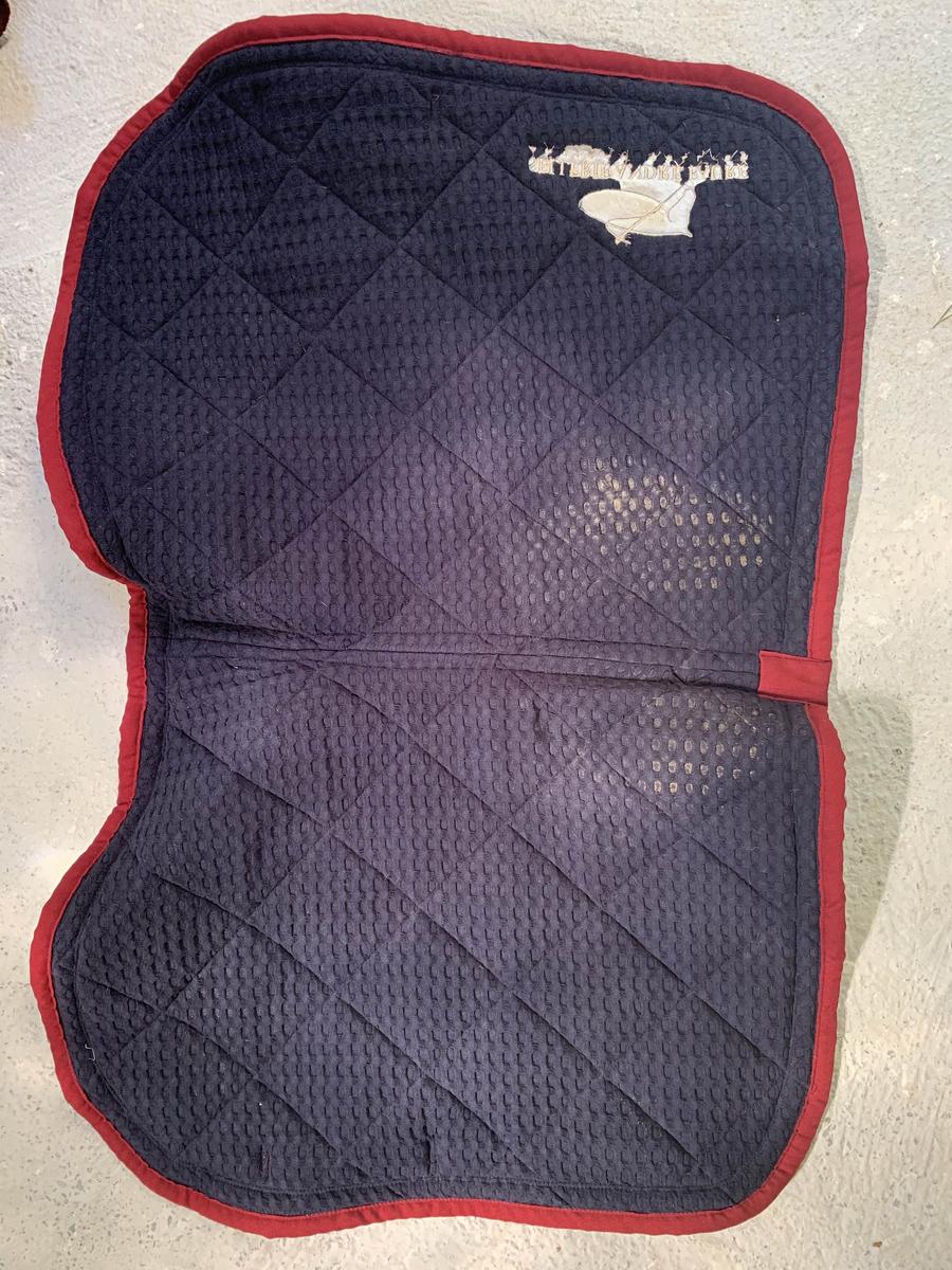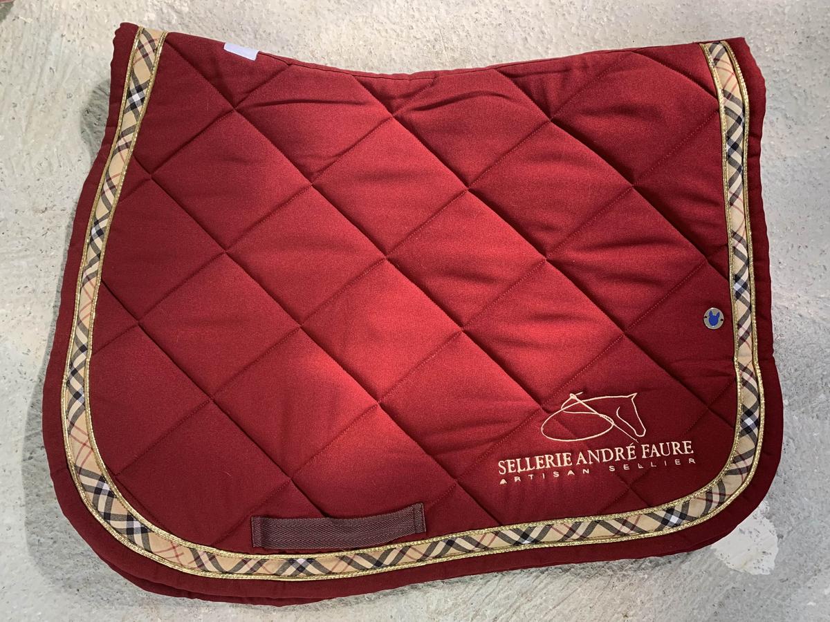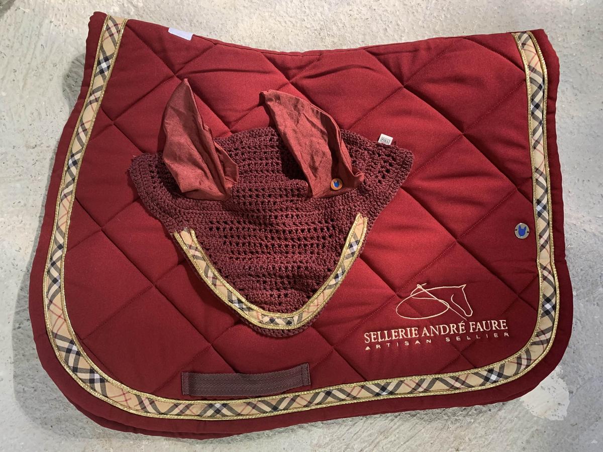Ensemble tapis + bonnet Equidées bordeaux, excellent état porté seulement 1 ou 2 fois. Liserés doré et biais écossais. Broderie « Sellerie André Faure ». L’ensemble taille cheval.