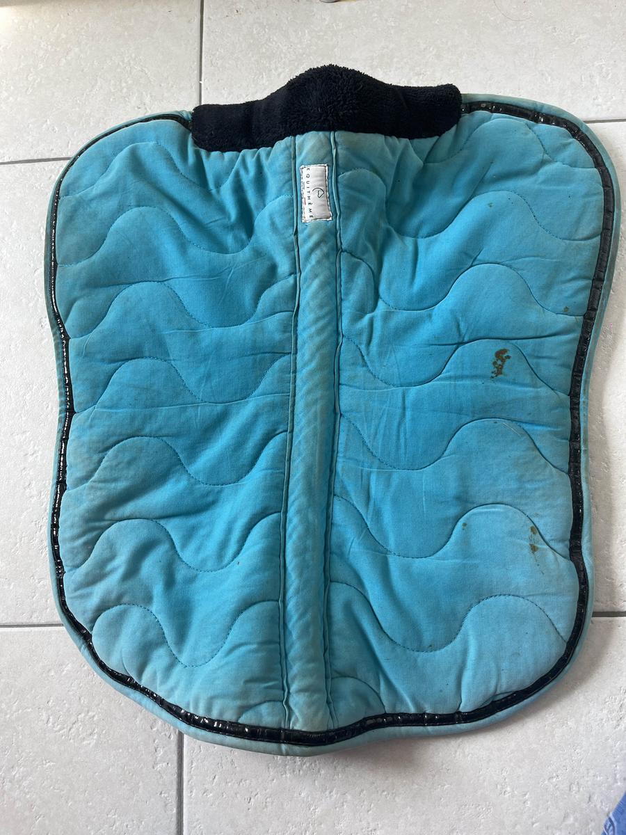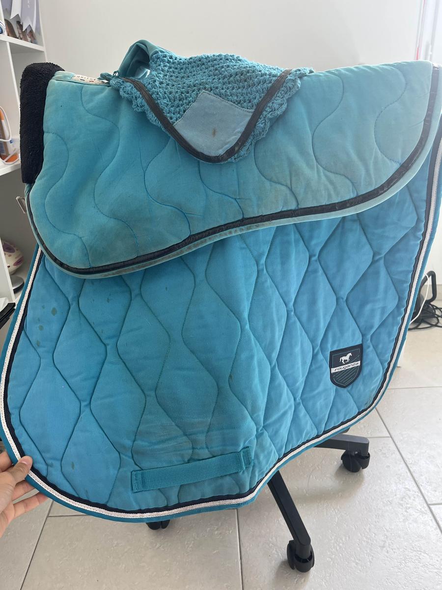 Ensemble tapis amortisseur et bonnet bleu, amortisseur et bonnet de la marque équiteme et tapis de la marque fouganza,