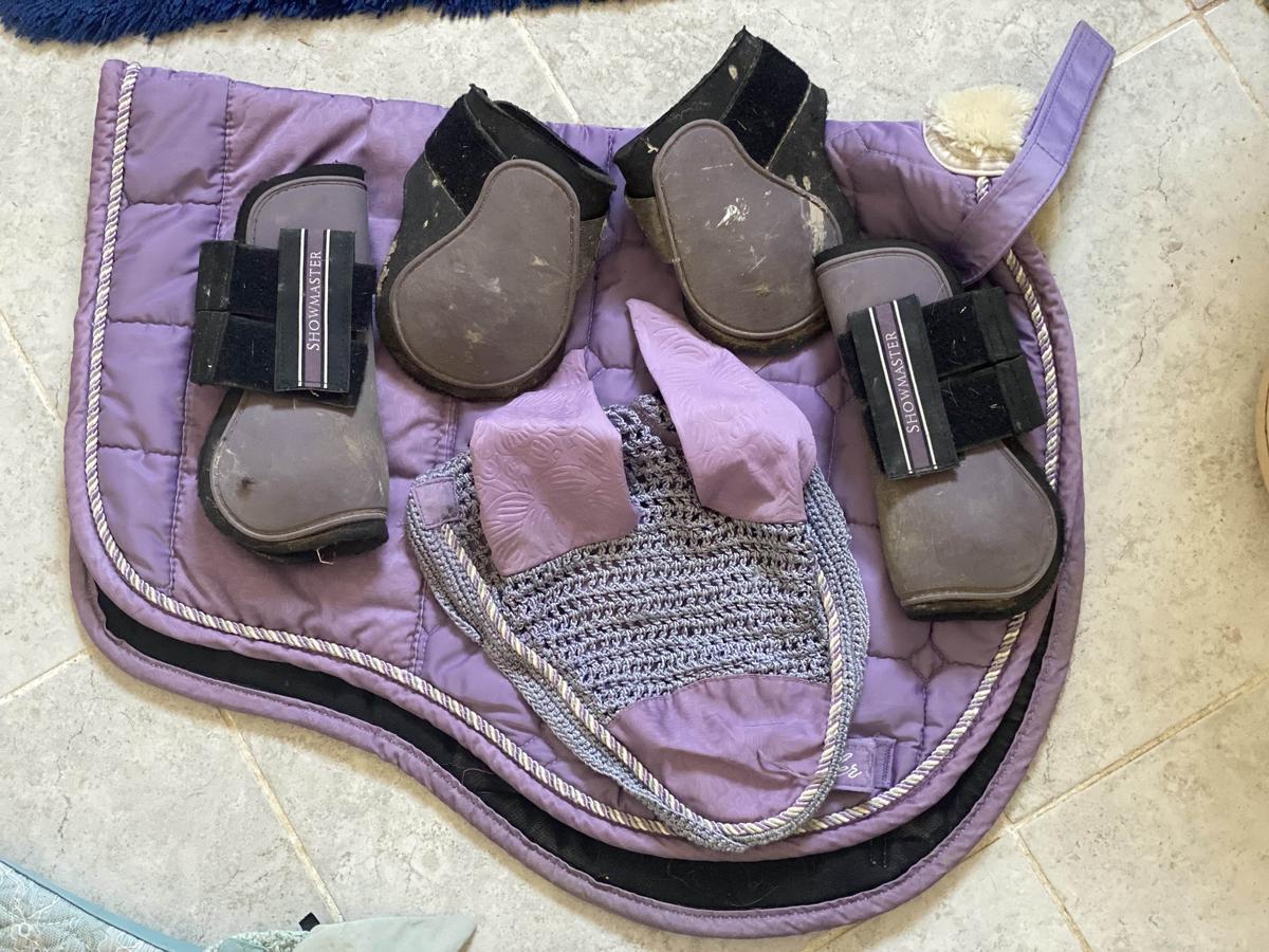 ensemble tapis bonnet guêtres taille poney violet en bonne état sera laver avant envois