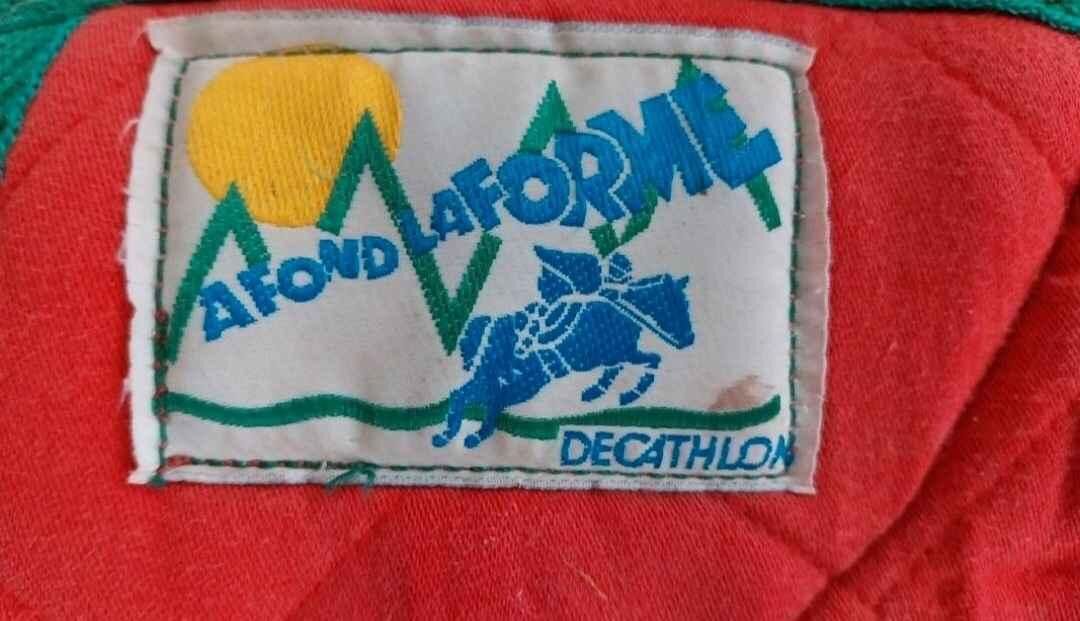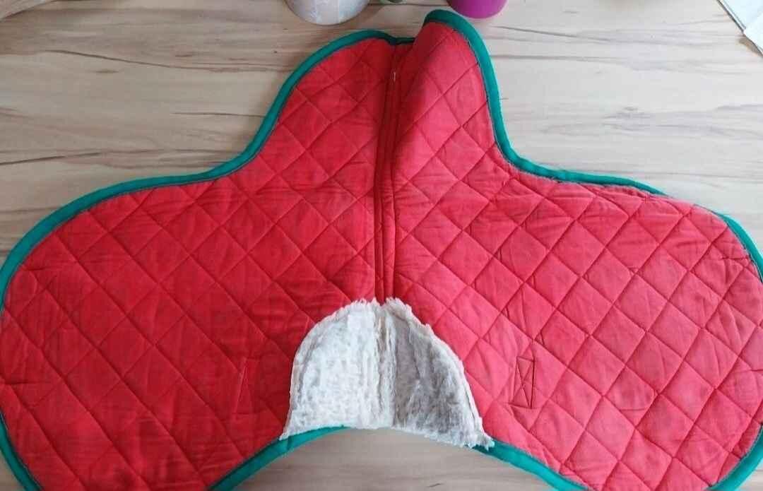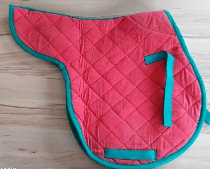 Tapis de hunter rouge avec contour et passant de sangle vert. En bon état. Marque decathlon. Bonnet taille poney. De couleur rouge avec un bord marron clair et une corde beige. Marque LAMI-CELL.