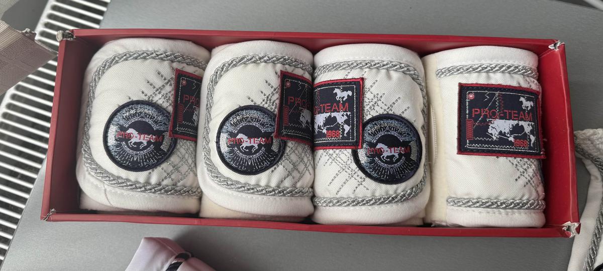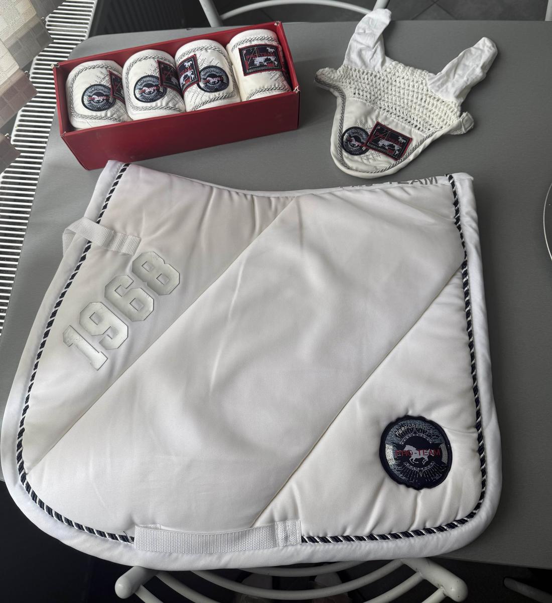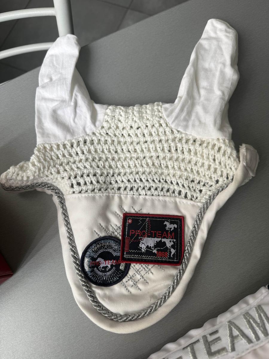 Ensemble blanc (bonnet taille poney, bandes, tapis)