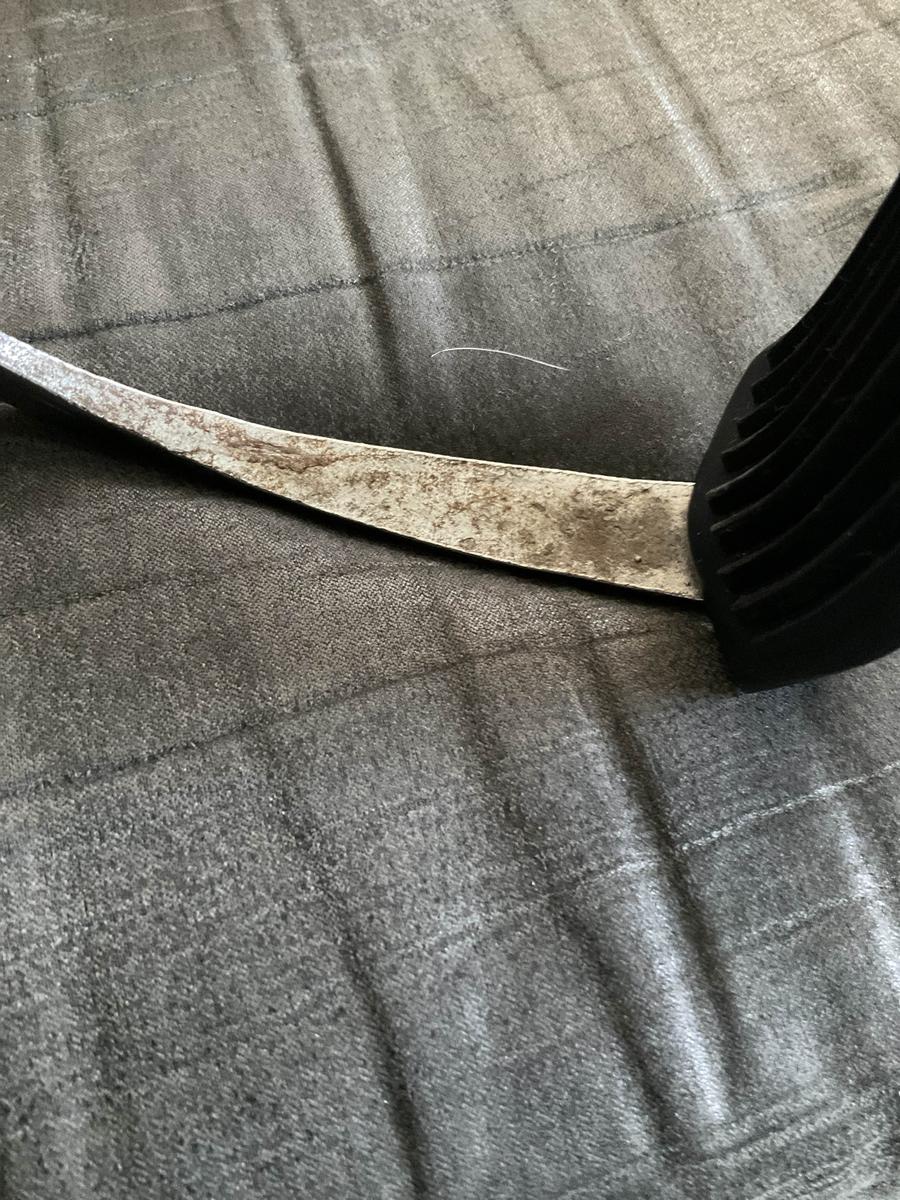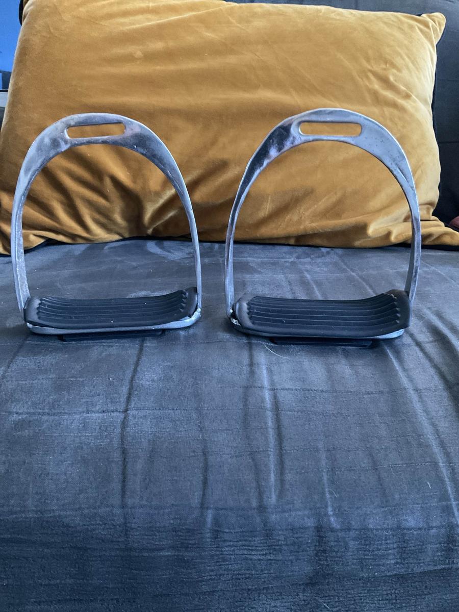 un peu rouiller sur l’intérieur dun des deux etriers , un peu déformé mais je les ai acheter comme sa . le placher senleve pour en mettre dautre , vendu sans étrivière , tout les defauts sont en photos . taille enfant mais convient parfaitement a un adulte