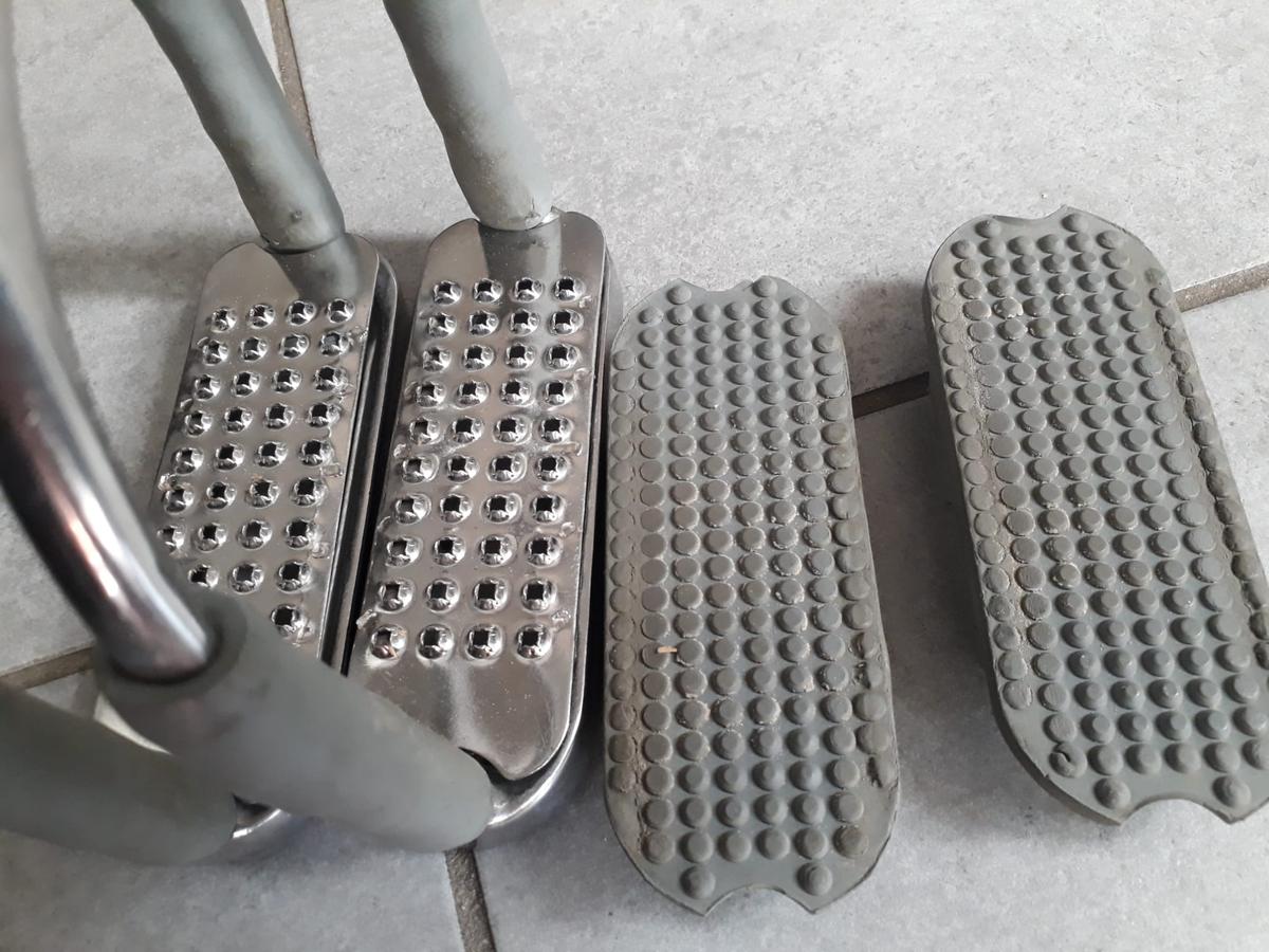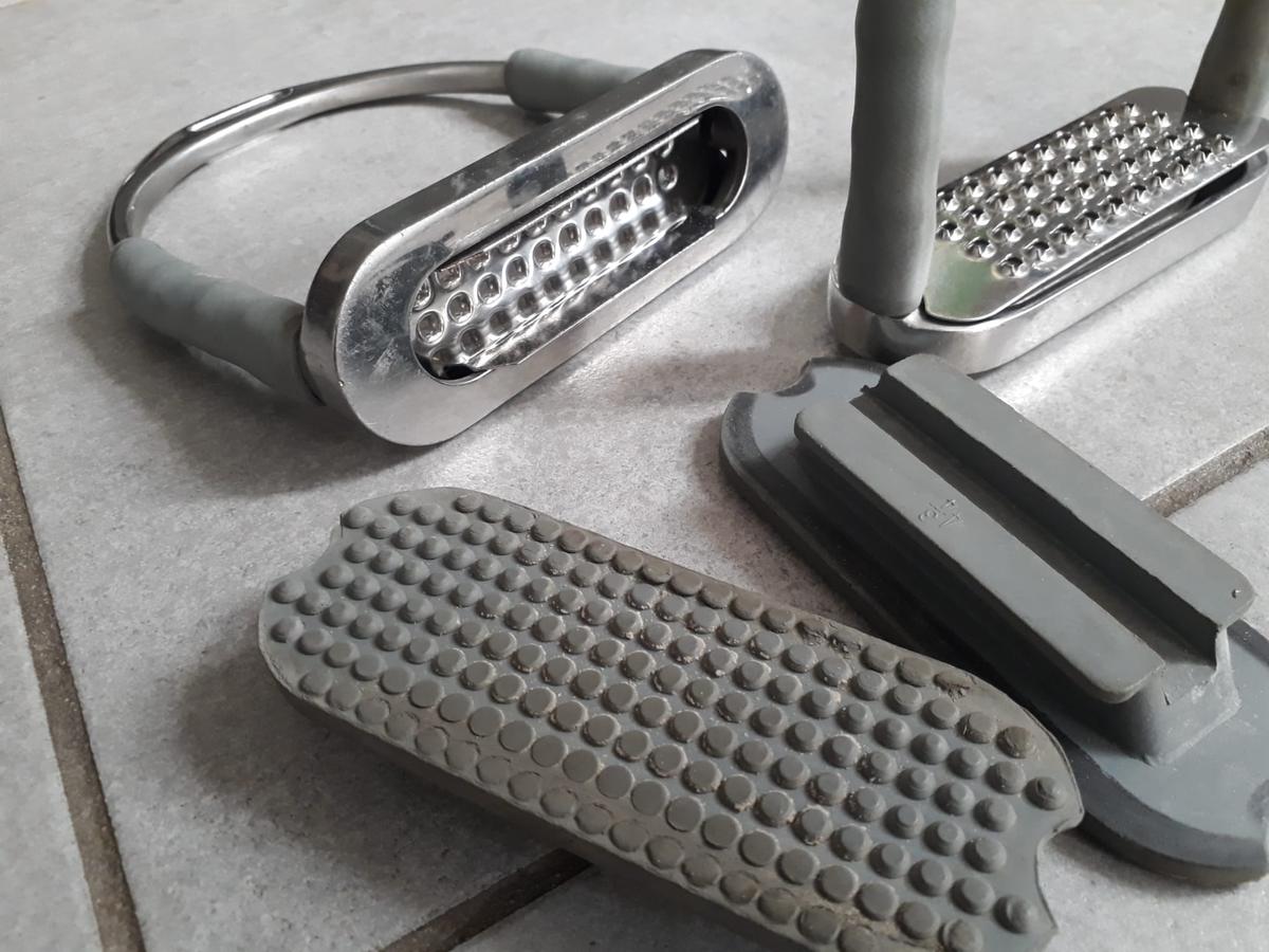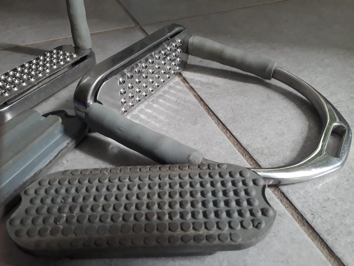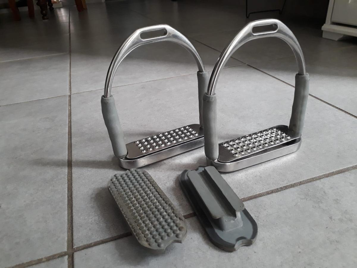 Etriers articulés de la marque Feeling. Fournis avec un plancher en fer perforé pour adhérer même par temps pluvieux, et plancher en caoutchouc.