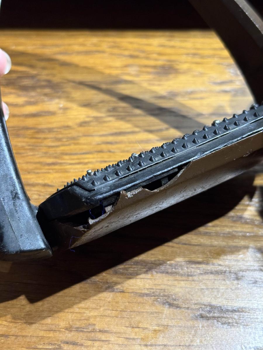 L’étrier droit est cassé à deux endroits, mais les fissures ne sont pas visibles à cheval et n’affectent pas du tout l’utilisation.